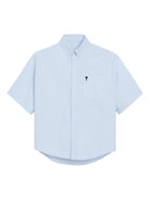 AMI BOXY SHORT SLEEVE LIGHT BLUE COTTON SHIRT. BOXY FIT SHIRT CRAFTED FROM LIGHT BLUE OXFORD COTTON, FEATURING A BUTTON-DOWN COLLAR, FRONT BUTTON FASTENING, A POCKET WITH LOGO EMBROIDERY PLACED ON THE CHEST, SHORT SLEEVES, A BACK YOKE, AND A ROUND HEM.