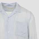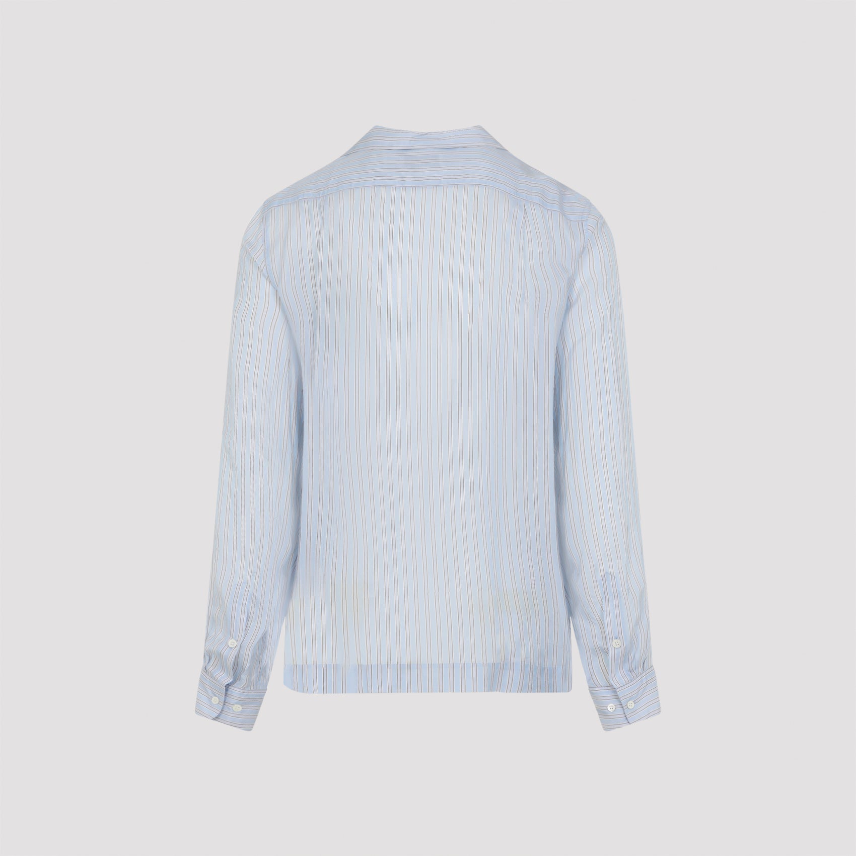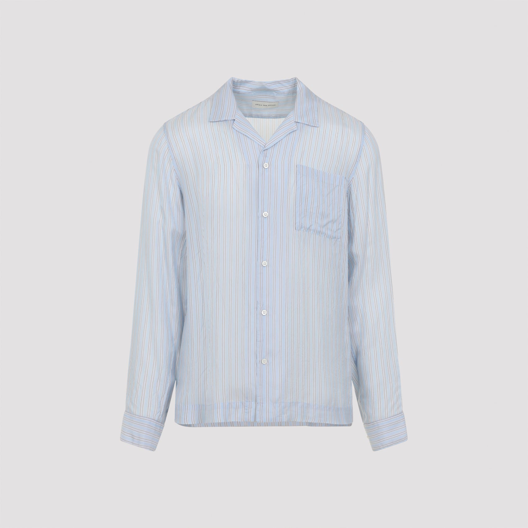 DRIES VAN NOTEN CARLTY LIGHT BLUE CUPRO SHIRT. CRAFTED FROM LIGHT BLUE STRIPED CUPRO, FEATURING A BOWLING COLLAR, FRONT BUTTON FASTENING, A PATCH POCKET ON THE CHEST, LONG SLEEVES WITH BUTTONED CUFFS, A BACK YOKE, AND A STRAIGHT HEM.