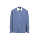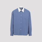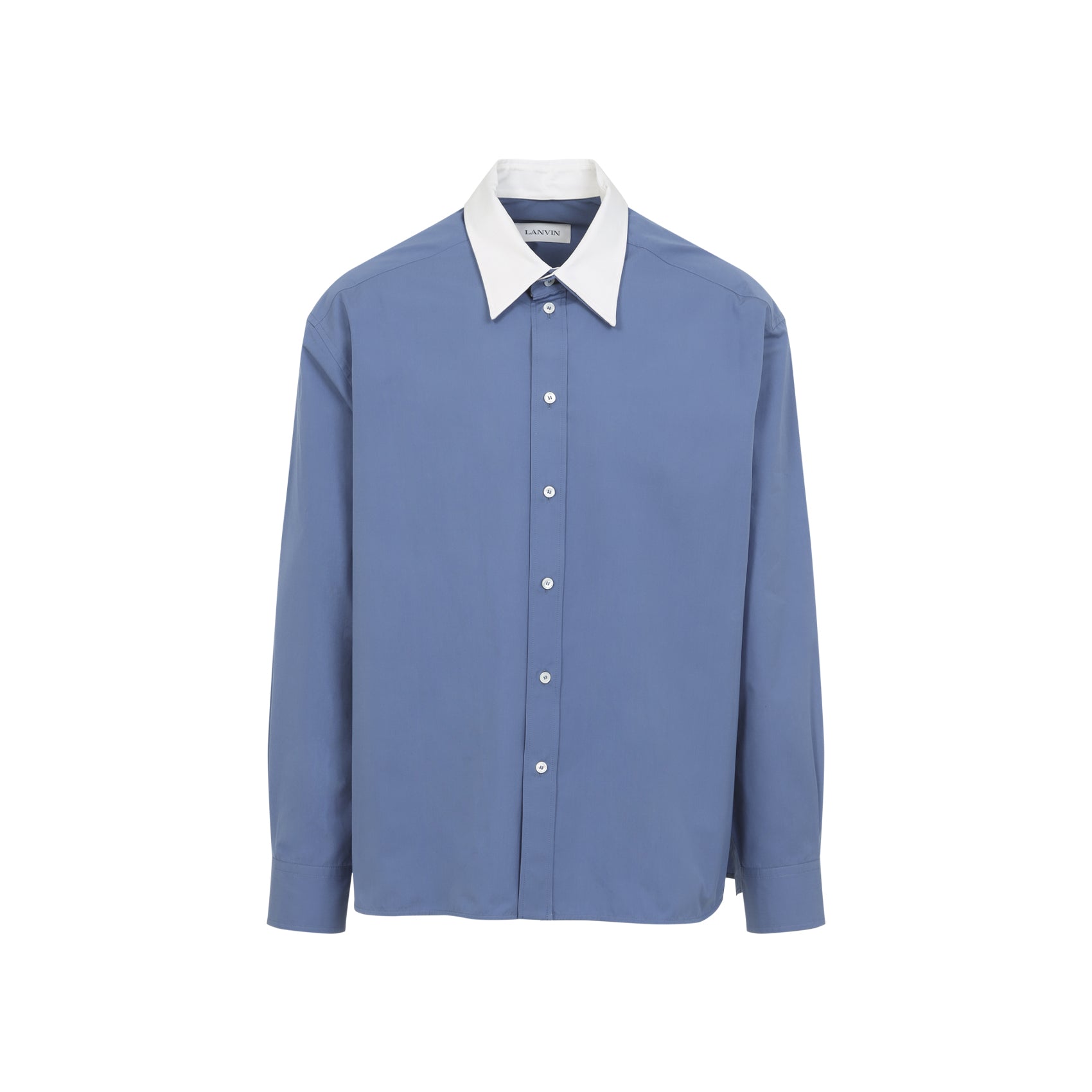 LANVIN LOOSE FIT LIGHT BLUE COTTON SHIRT. A RELAXED FIT SHIRT CRAFTED FROM LIGHT BLUE COTTON POPLIN, IT FEATURES A WHITE CONTRASTING POINTED COLLAR, FRONT BUTTON FASTENING SLIGHTLY DROPPED SHOULDERS, LONG SLEEVES WITH BUTTONED CUFFS, A BACK YOKE WITH TWO DARTS, ROUNDED HEM.