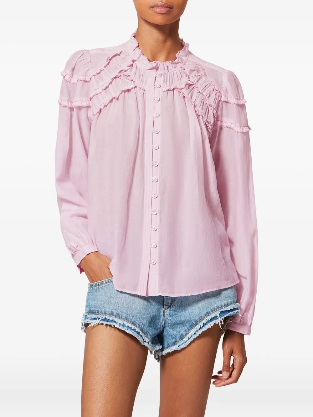 Elevate your everyday wardrobe with this enchanting light pink cotton blouse from Isabel Marant. Featuring romantic scalloped ruffle detailing across the shoulders and chest, this feminine piece combines Parisian elegance with effortless wearability.