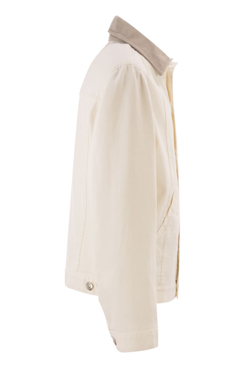 LIGHTWEIGHT GARMENT-DYED COTTON DENIM JACKET WITH LEATHER COLLAR