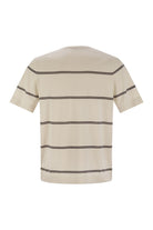THE QUALITY OF BRUNELLO CUCINELLI'S MATERIALS ENRICHES THE STYLE OF THIS PURE COTTON KNIT T-SHIRT, MADE FROM A LIGHTWEIGHT YARN, IDEAL FOR WARMER CLIMATES. THE STRIPED MOTIF IN CONTRASTING SHADES ADDS A DISTINCTIVE TOUCH TO THE GARMENT'S SIMPLE AND CLEAN STYLE. THE FIT OFFERS REGULAR VOLUMES. THE PROCESSING OF THE PURE COTTON YARN ENHANCES THE QUALITIES OF THE NATURAL FIBRE AND MAKES THE GARMENT LIGHT AND COMFORTABLE TO WEAR. - RIB-KNIT CREW NECK - REGULAR SHOULDER - RIBBED CUFFS AND HEM - PLAIN KNIT DESIGNER ID: M29805500 CTD66