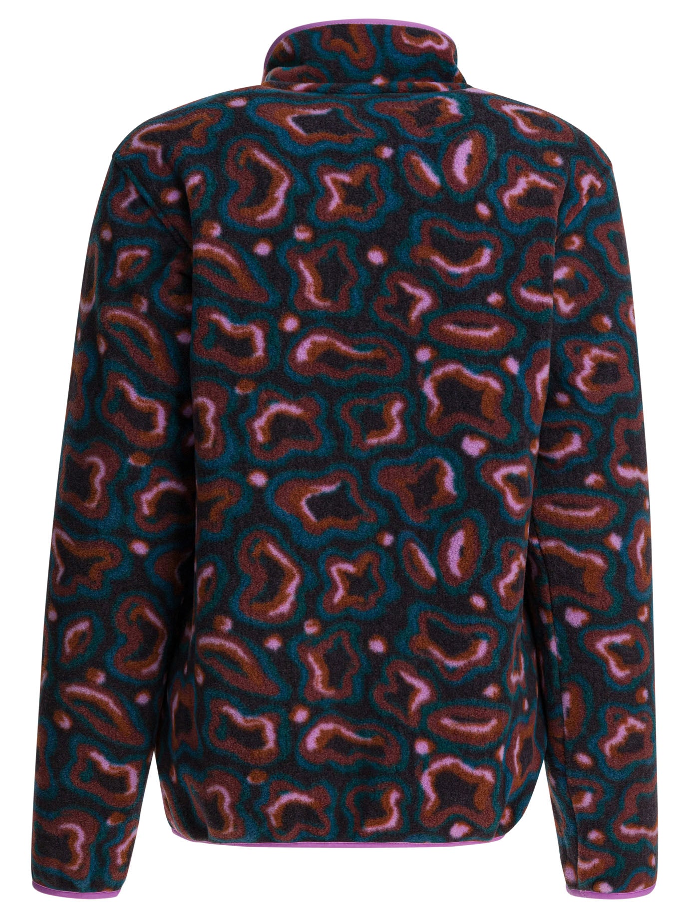 Embrace effortless style and comfort with this Patagonia Lightweight Synchilla Snap-T Fleece Jacket. Crafted from Patagonia's signature soft and cozy Synchilla fleece, this pullover features a distinctive abstract leopard print in rich jewel tones with vibrant pink and purple accents.