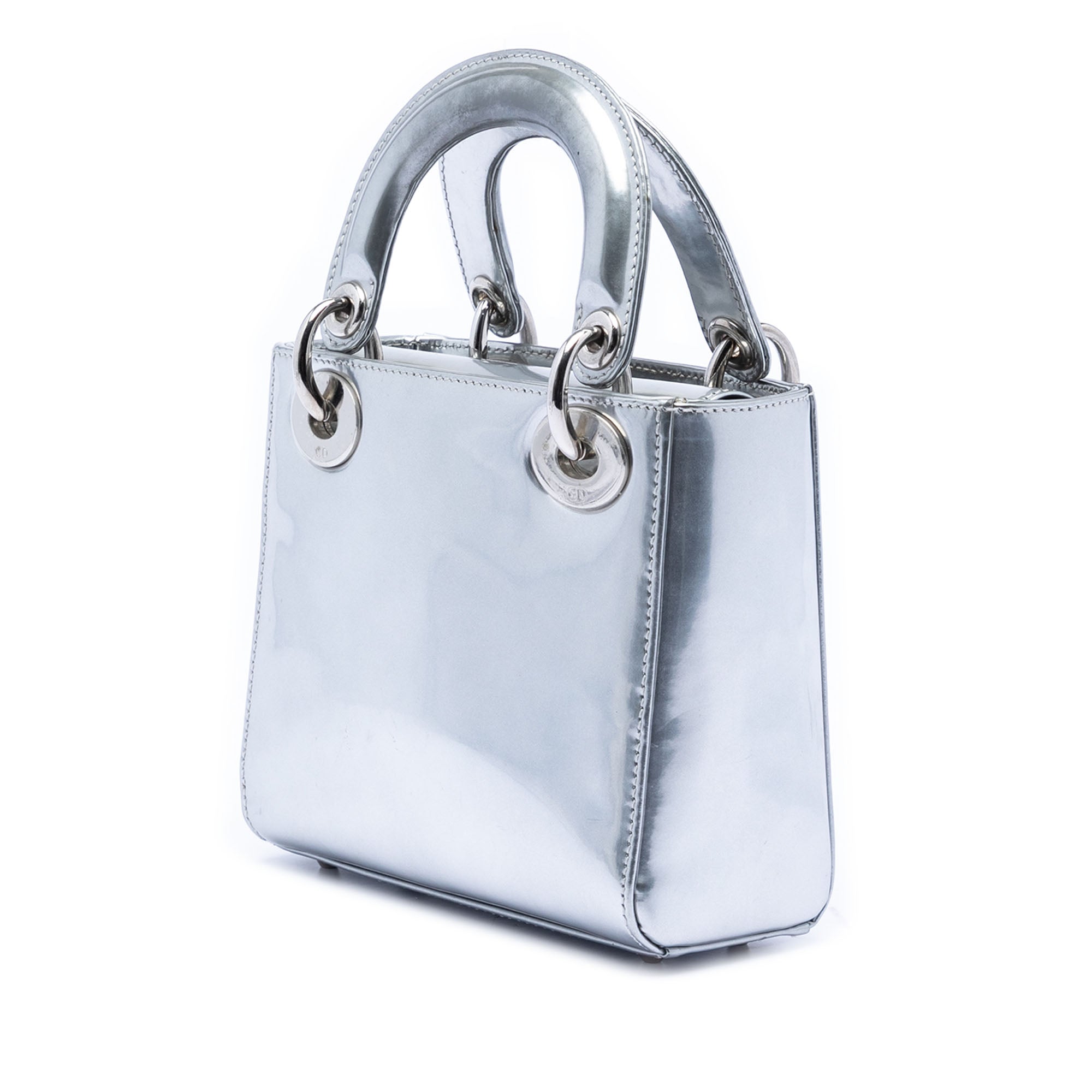 The Lady Dior features a metallic calfskin body, flat leather top handles, a detachable flat strap, a fold-in flap closure, and interior zip and slip pockets.