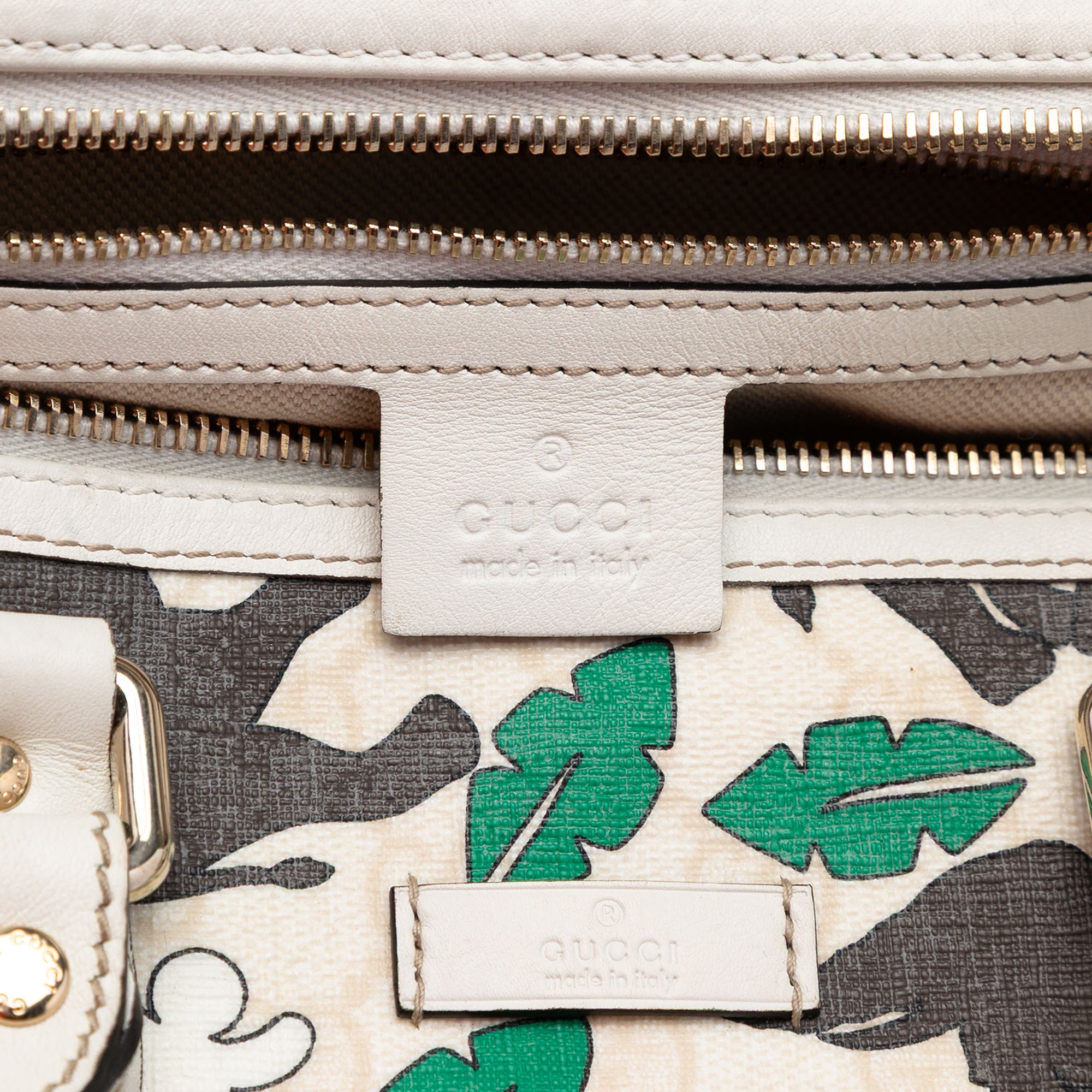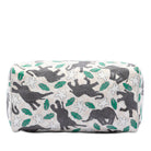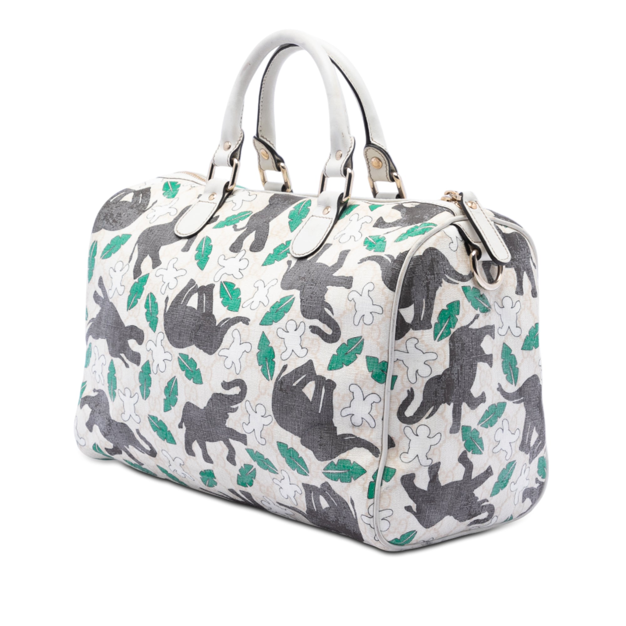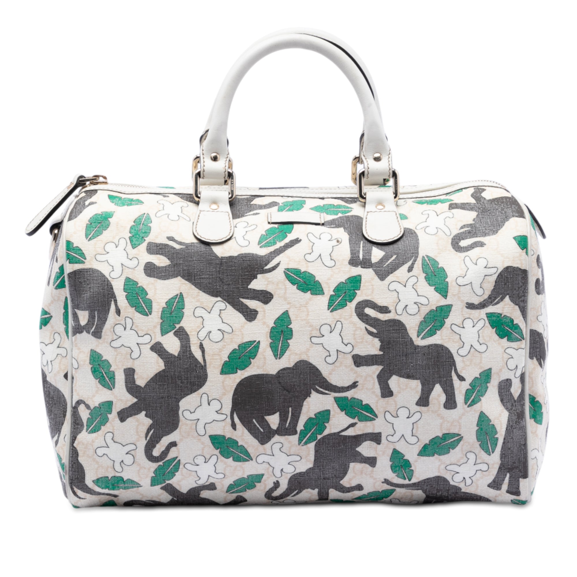 This boston bag features an elephant print on a coated canvas body with leather trim, rolled leather handles, a top zip closure, and an interior zip pocket.