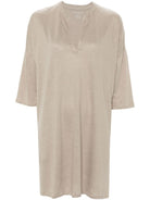 MEDIUM BEIGE LINEN BLEND STRETCH-DESIGN SLUB TEXTURE V-NECK THREE-QUARTER LENGTH SLEEVES SIDE SLITS STRAIGHT HEM THIS ITEM CONTAINS AT LEAST 50% MATERIALS WHICH ARE CERTIFIED OR WIDELY RECOGNISED AS HAVING A LOWER ENVIRONMENTAL IMPACT THROUGH PRODUCTION AND/OR MANUFACTURING PROCESSES THAT REDUCE WATER CONSUMPTION AND THE USE OF HARMFUL CHEMICALS, OR RE-USE BY-PRODUCTS OF THE PRODUCTION PROCESS. LEARN MORE ABOUT WHAT MAKES A PRODUCT CONSCIOUS ON OUR CONSCIOUS CRITERIA PAGE
