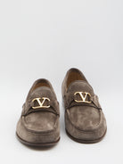 Elevate your everyday style with these sophisticated loafers from Valentino Garavani. Crafted from luxurious suede leather and adorned with signature gold-tone hardware, these timeless flats effortlessly blend classic elegance with contemporary flair.