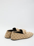 Sand beige GG fabric loafers. Featuring a square toe, gold-tone Morsetto, leather lining, leather sole. Dust bag included. Any imperfections in the leather are not to be considered manufacturing defects, but a characteristic of the material.
