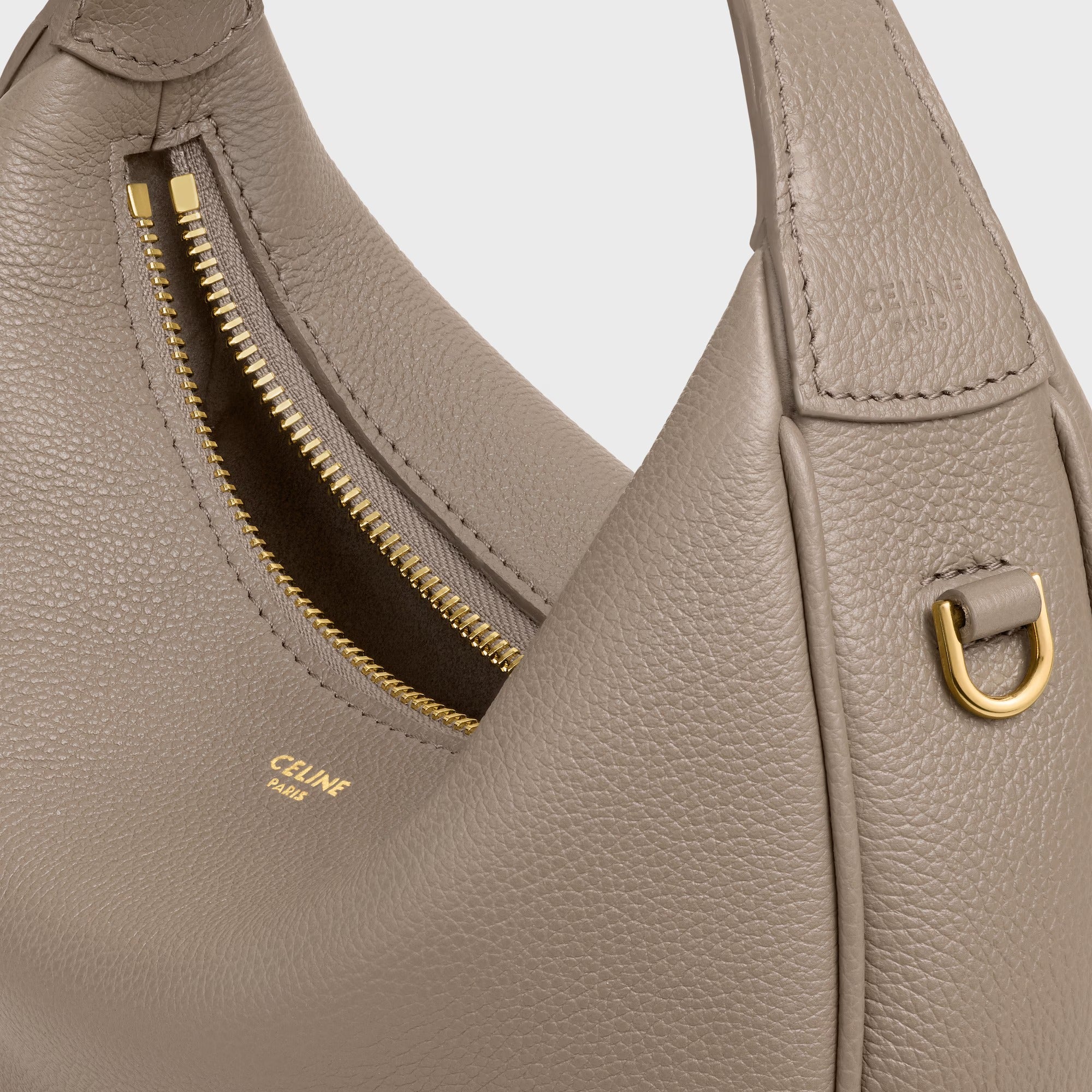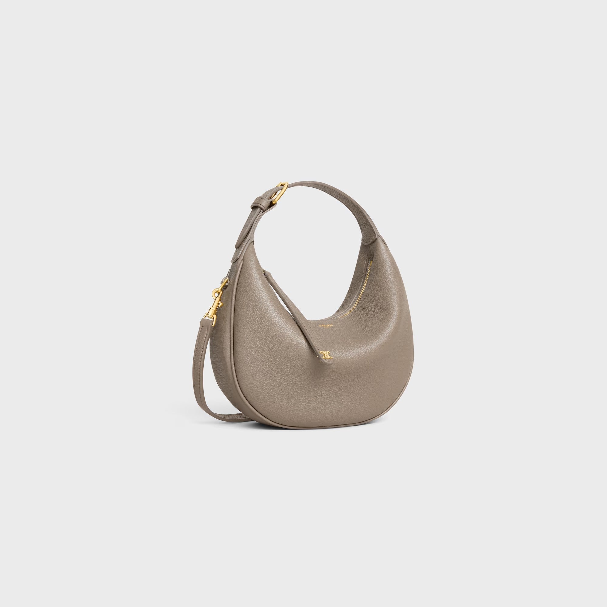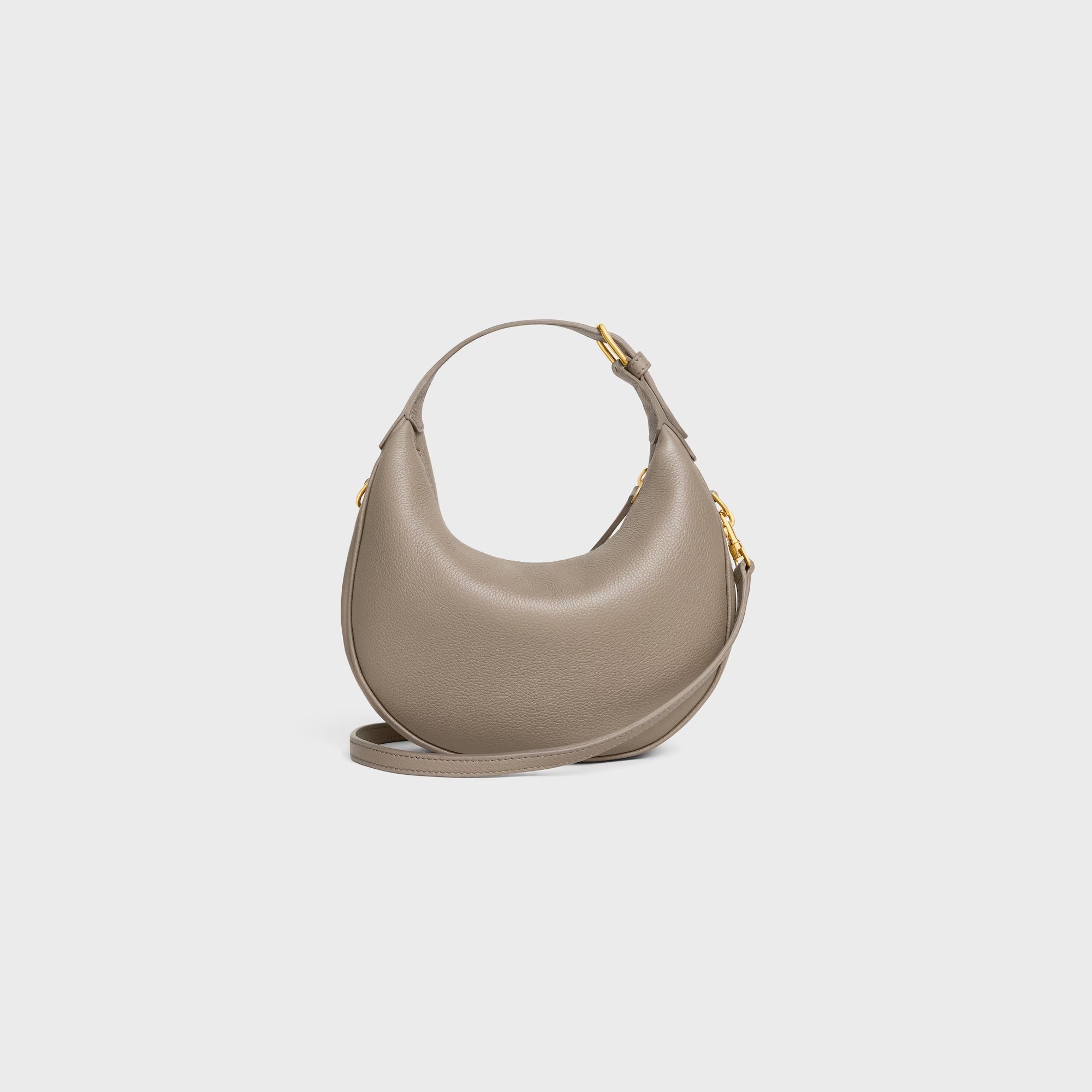 Introducing the "LuLu Teen" small shoulder bag by Celine, a timeless accessory that effortlessly combines luxury with everyday functionality. This beautifully crafted hobo-style bag features a sleek curved silhouette in a sophisticated taupe hue, making it the perfect neutral companion for any outfit.