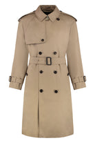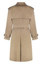 MADE OF WATER-RESISTANT COTTON GABARDINE. CHARACTERIZED BY A DOUBLE-BREASTED DESIGN AND AN ADJUSTABLE WAIST STRAP WITH BUCKLE. THE SLEEVES ARE LONG AND CAN BE ADJUSTED WITH A STRAP. COLLAR WITH HOOK CLOSURE.