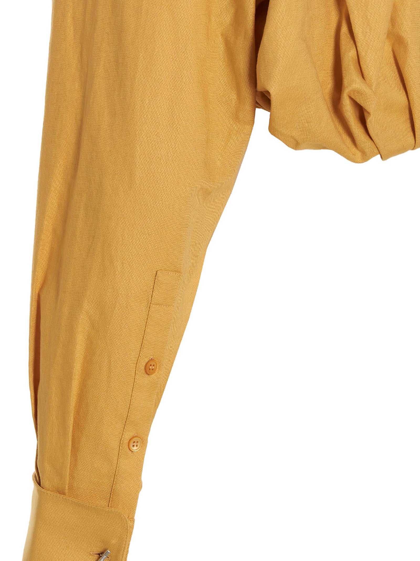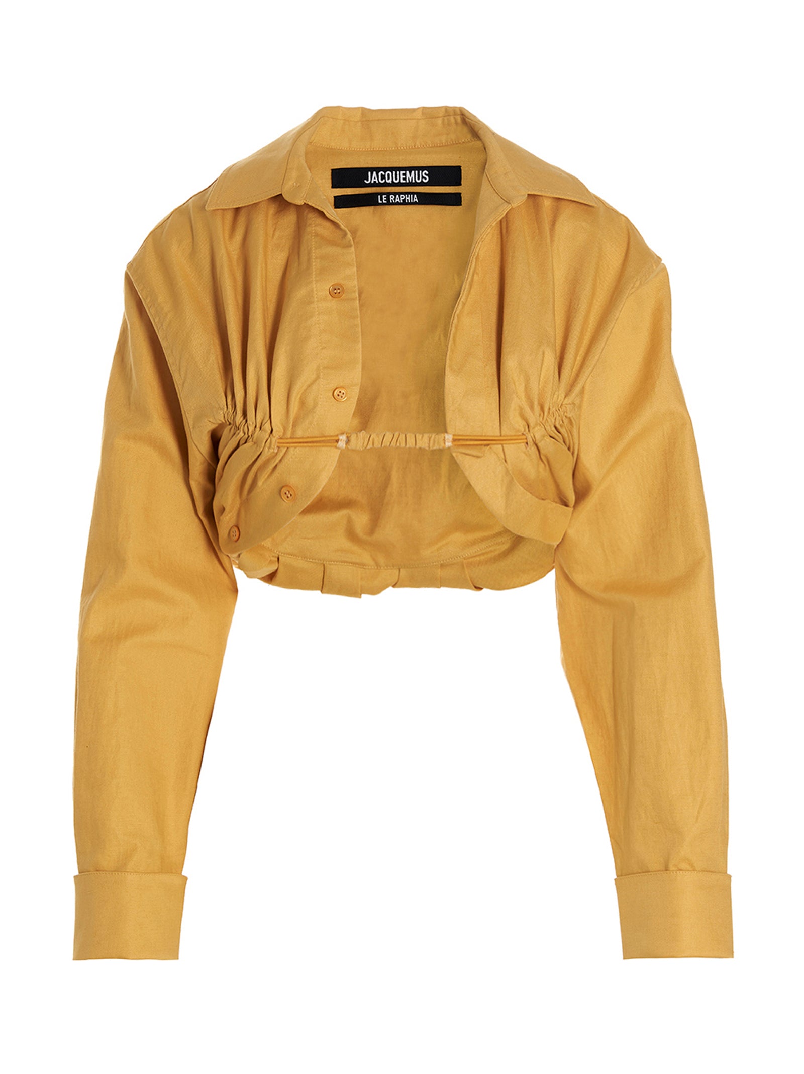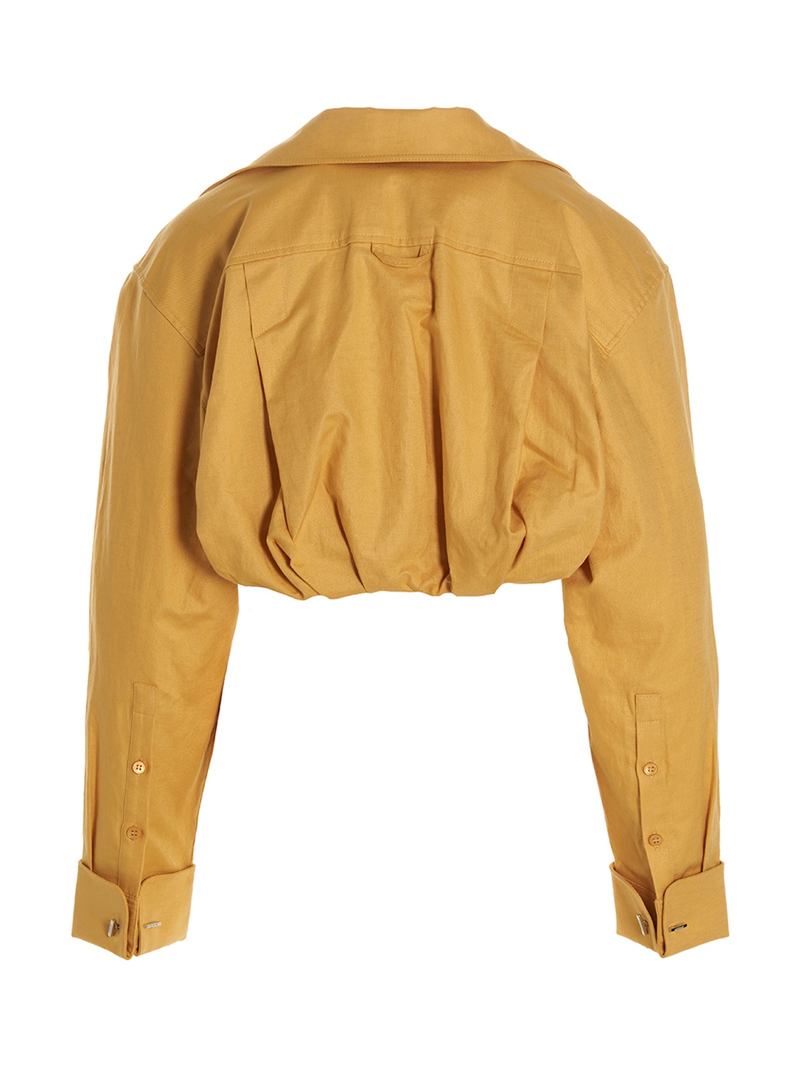 Elevate your everyday wardrobe with the 'Ma viscose' shirt from Jacquemus. This sophisticated bolero-style cropped shirt features luxurious cashmere and cotton fabrication with distinctive crinkled details throughout. The design showcases elegant mother-of-pearl buttons at the front, long cuffed sleeves with metal cuff accents, and a flattering front elastic that creates beautiful texture and dimension. The cropped silhouette and crinkled back detail add a contemporary edge to this refined piece. Perfect for pairing with high-waisted trousers or skirts, this versatile shirt transitions effortlessly from casual daytime looks to elevated evening ensembles. The unique bolero cut and premium materials make this a standout addition to any discerning wardrobe.