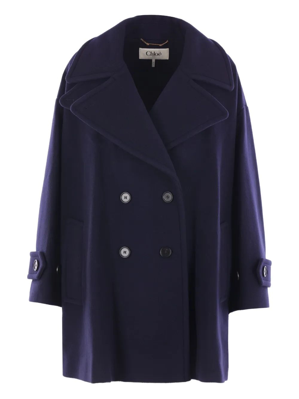 Elevate your outerwear collection with the MA26 Jacket from Chloé. This sophisticated peacoat features a timeless double-breasted silhouette in a rich navy blue hue, complete with wide lapels and elegant buckle details at the cuffs.