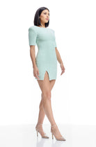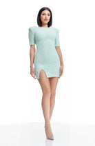 Elevate your style with our Maddox Dress, a chic bodycon mini dress featuring short sleeves, a round neck, and a body-hugging silhouette with a front side slit.