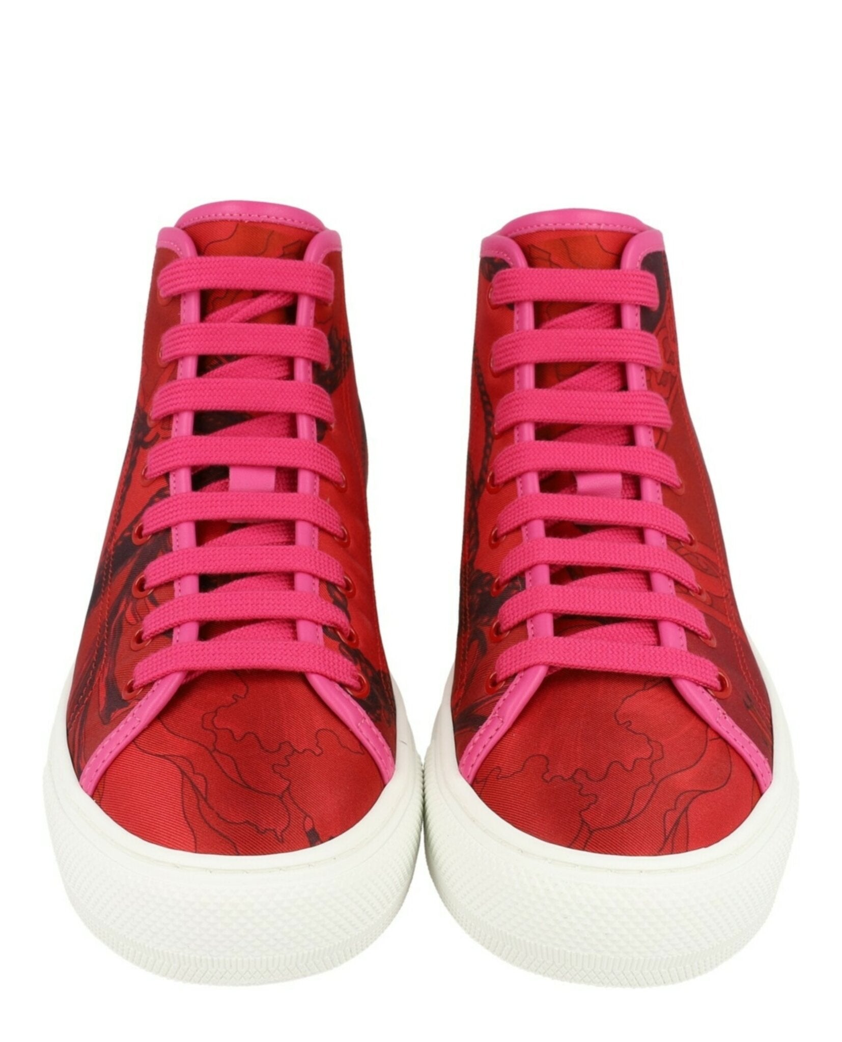 Elevate your sneaker game with the Mafalda 1 Sneakers from Ferragamo. These stunning high-top sneakers feature an eye-catching baroque print that makes a bold fashion statement, complemented by the embossed Gancini logo around the platform for signature luxury branding.