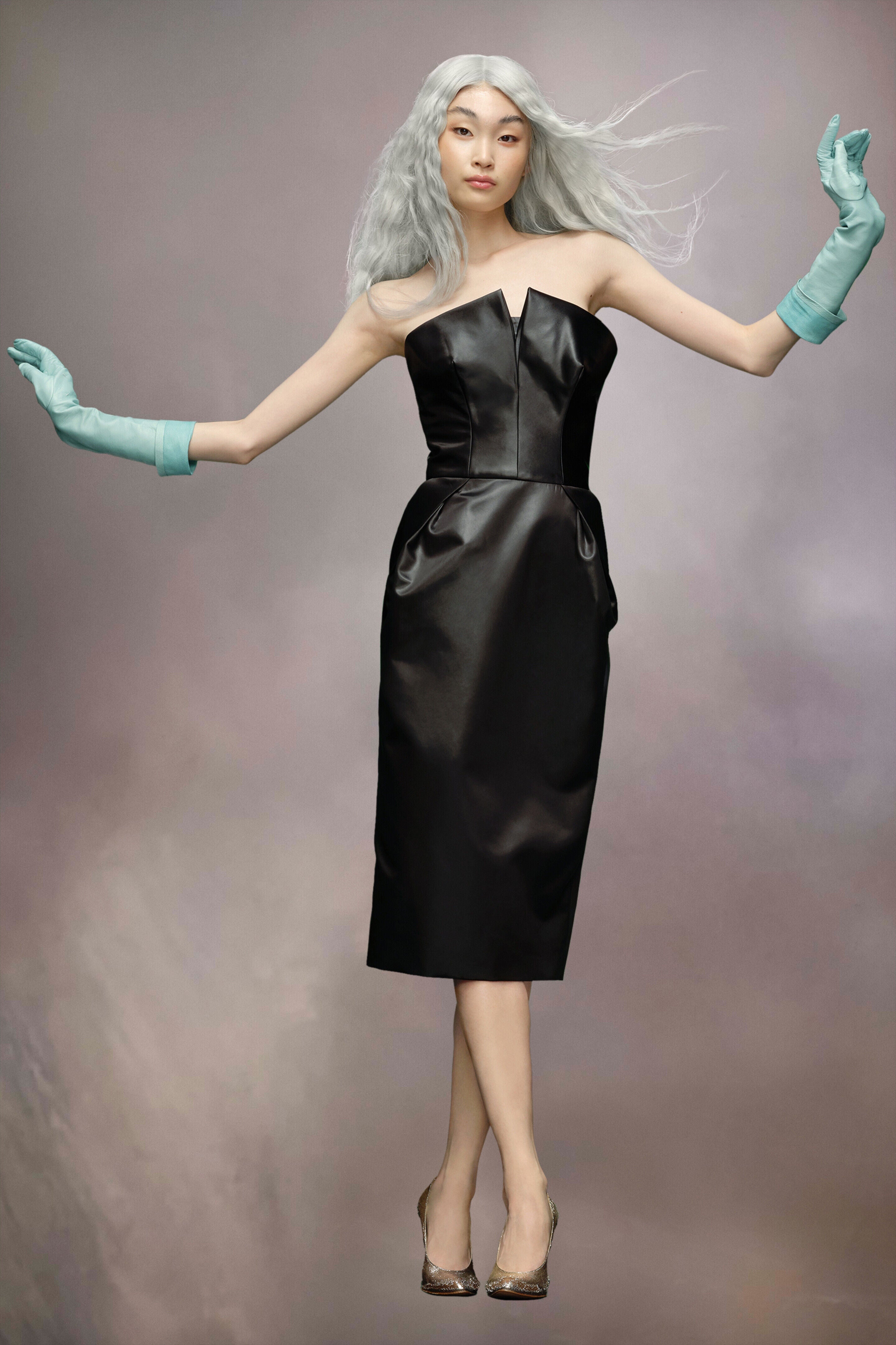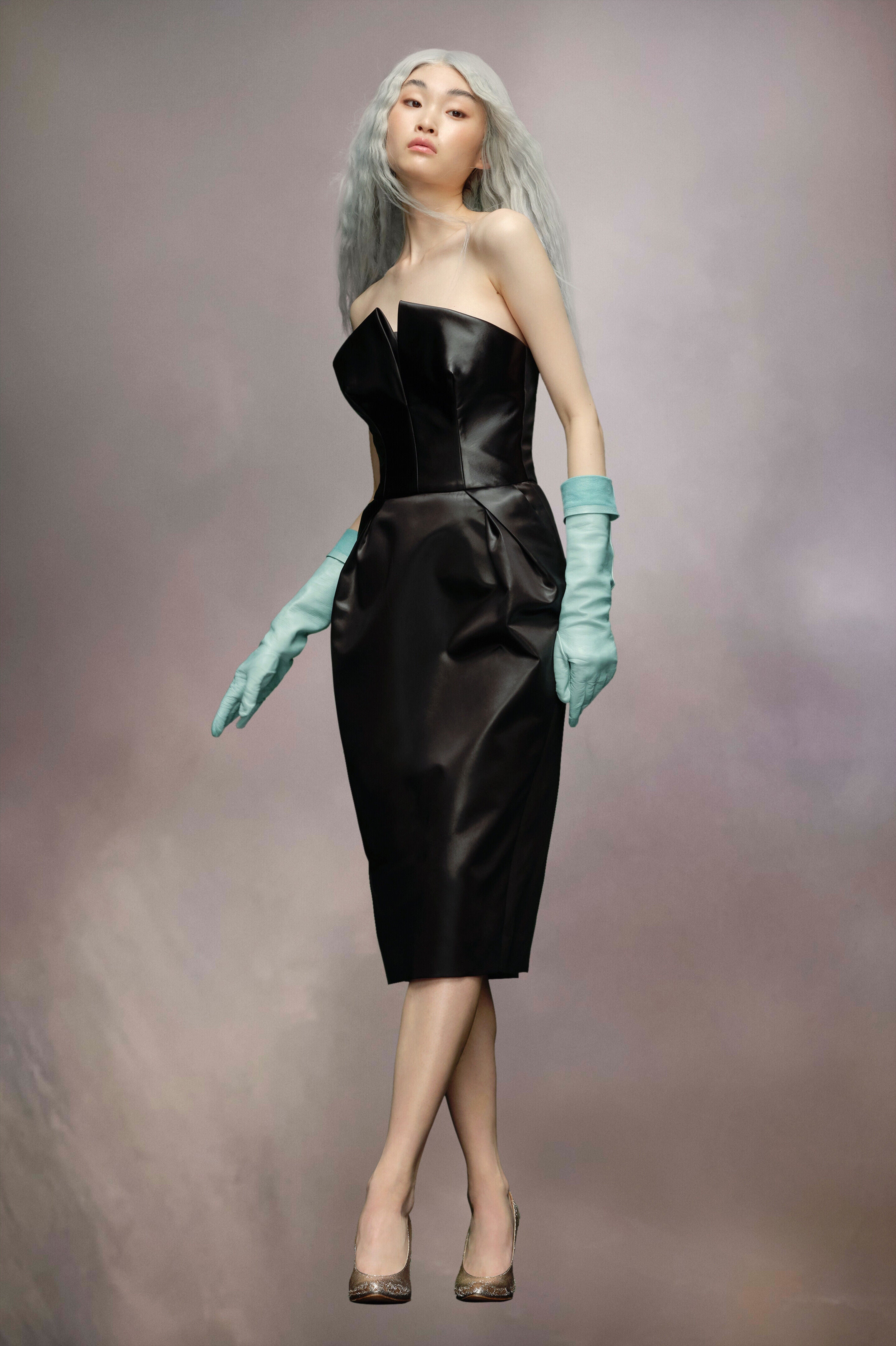 Elevate your evening wardrobe with this stunning strapless dress from MAISON MARGIELA. Crafted in luxurious black satin, this sophisticated piece features a structured bodice with a flattering sweetheart neckline and a sleek pencil silhouette that hits at the knee.