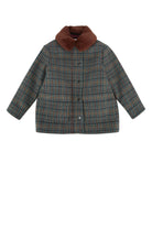 Introducing the sophisticated Manteau Joao from BONPOINT KIDS, a timeless plaid winter coat that combines classic French elegance with modern functionality. This beautifully crafted jacket features a rich checkered pattern in muted tones, complemented by a luxurious brown corduroy collar that adds both warmth and refined style.