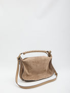 Boysh brown suede calfskin shoulder bag. Features a hand-wrapped single top handle, removable and adjustable shoulder strap, one open front pocket with flap, zip closure, one main compartment, one flat internal pocket, linen and cotton lining. Dust bag included. Any leather imperfections are not to be considered manufacturing defects, but a characteristic of the material.