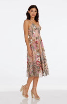 For a timeless and flattering look, this midi dress boasts a sleeveless v-neck and a stylish fit and flare silhouette. Perfect for any occasion, it's a versatile addition to your wardrobe.