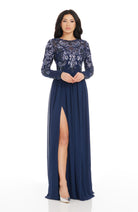 The Martha is an elegant long sleeve fit and flare gown featuring illusion details and a flattering belt, perfect for making a timeless statement at any formal event.