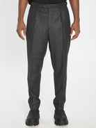 TROUSERS IN ANTHRACITE GREY WOOL. FEATURING CONCEALED CLOSURE WITH ZIP, BUTTON AND HOOK, BELT LOOPS, INTERNAL WAISTBAND WITH BUTTONS TO ADJUST THE FIT, TWO SIDE WELT POCKETS, AND TWO BACK WELT POCKETS WITH FLAPS. CLASSIC FIT.