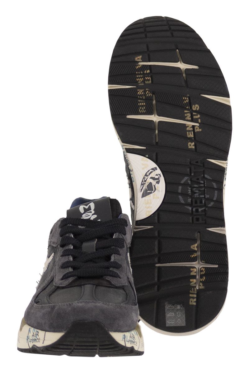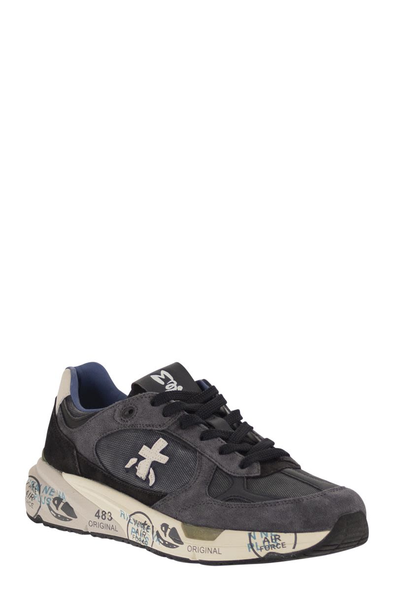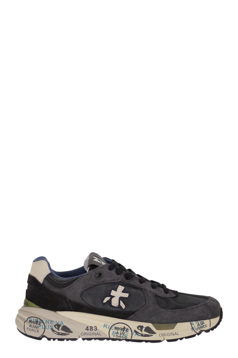 THE PREMIATA MASE IN THIS VERSION IS CHARACTERISED BY A MIX OF MATERIALS, TECHNICAL FABRIC, SUEDE AND LEATHER DETAILS ON THE BUTTONHOLES AND TOE. SUEDE DETAILS ARE PRESENT ON THE SIDES AND ON THE HEEL. THE EVER-PRESENT SYMBOL ON BOTH SIDES. - GENUINE LEATHER - FABRIC LACES - RUBBER SOLE DESIGNER ID: MASE25 8014 SOLE HEIGHT: 4 CM