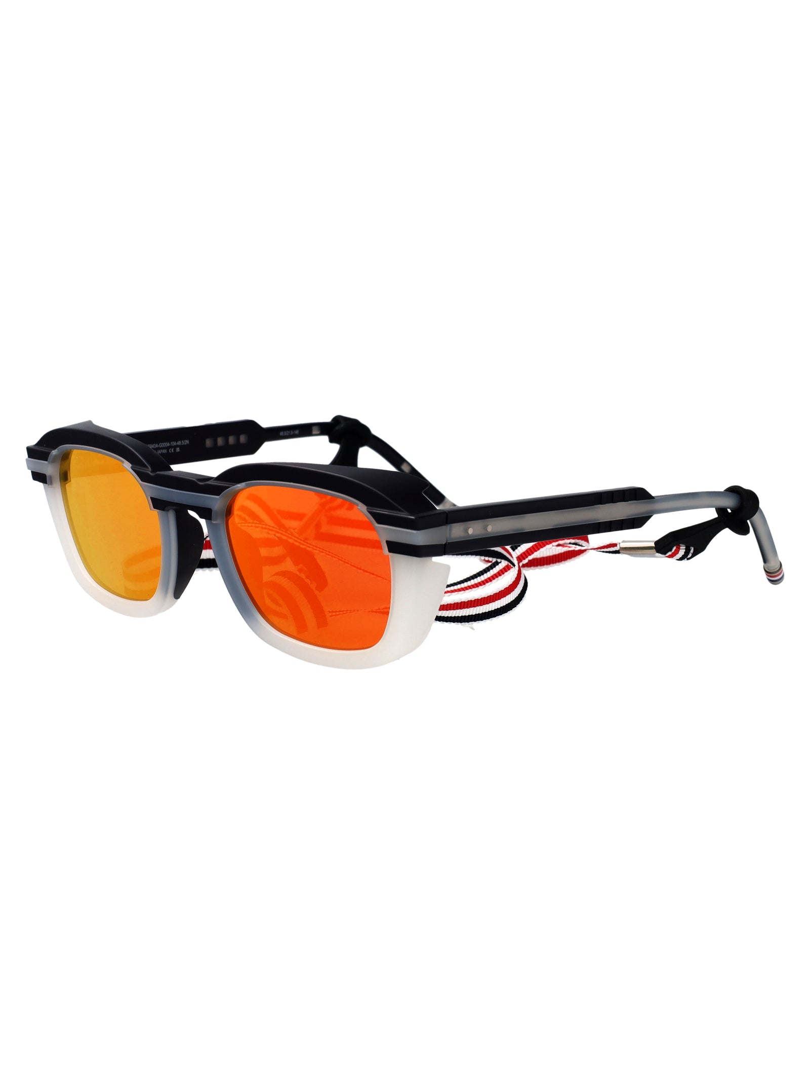 Elevate your eyewear collection with these distinctive Thom Browne sunglasses, featuring a striking matte hazy white nylon frame accented with dark navy rubber injection molding. The bold red-orange lenses provide both UV protection and a fashion-forward statement, while the iconic Thom Browne tricolor stripe detailing on the temples adds unmistakable designer appeal.
