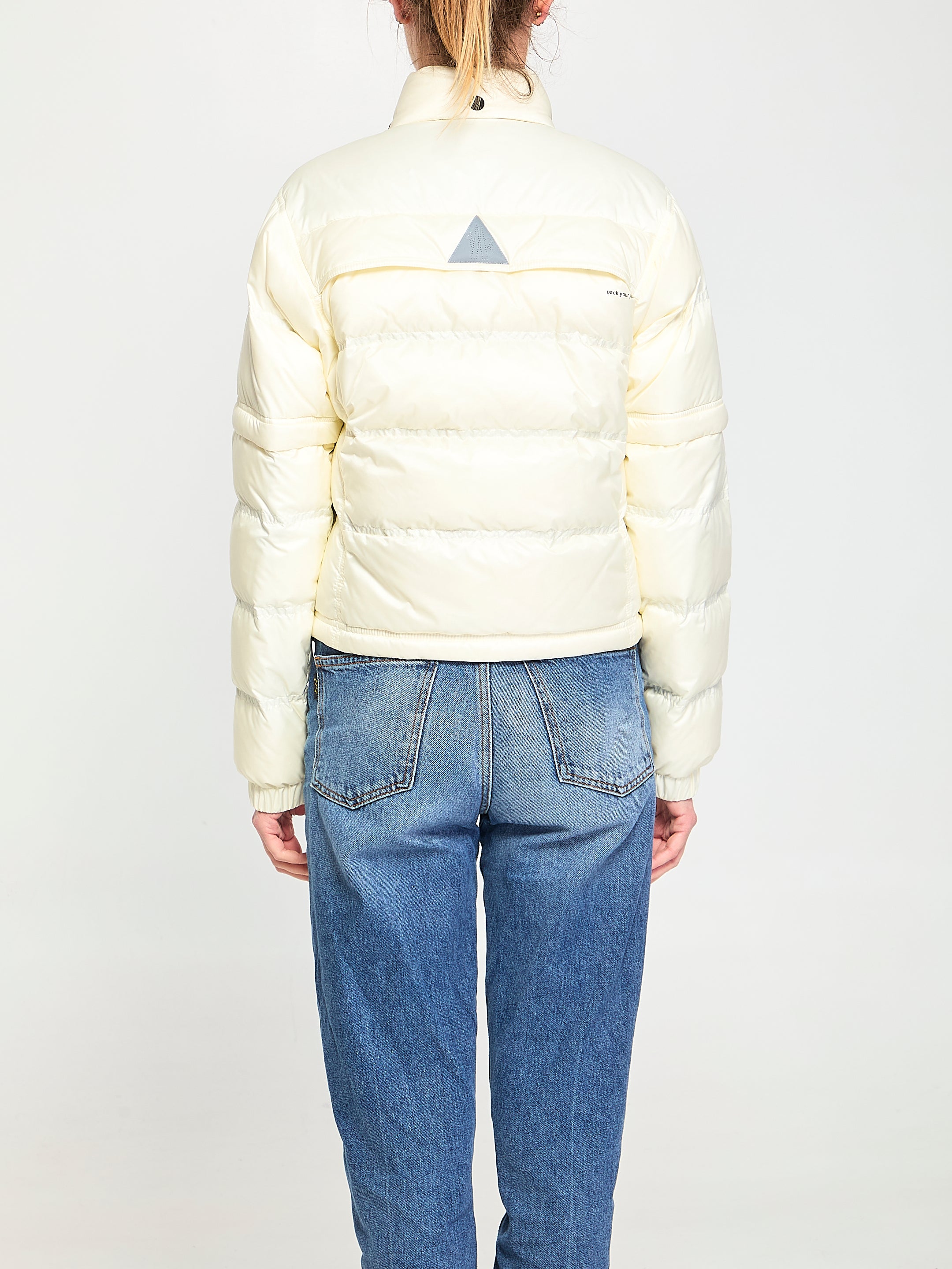 SHORT WHITE PADDED NYLON DOWN JACKET. IT FEATURES A HIDDEN ADJUSTABLE HOOD WITH A DRAWSTRING, FRONT ZIP CLOSURE AND A DOUBLE ROW OF BUTTONS TO ADJUST THE SILHOUETTE, TWO FRONT ZIP POCKETS, ONE FLAP CHEST POCKET WITH BUTTON, AN INTERNAL DRAWSTRING AT THE HEM, LONG SLEEVES, ELASTICATED CUFFS, AN APPLIED LOGO PATCH ON THE SLEEVE, SLEEVE ZIPS TO CONVERT TO SHORT SLEEVES, A LIGHT BLUE POLYESTER LINING, A BREATHABLE BACK DETAIL AND A BACK POCKET. FOLDABLE ITEM.