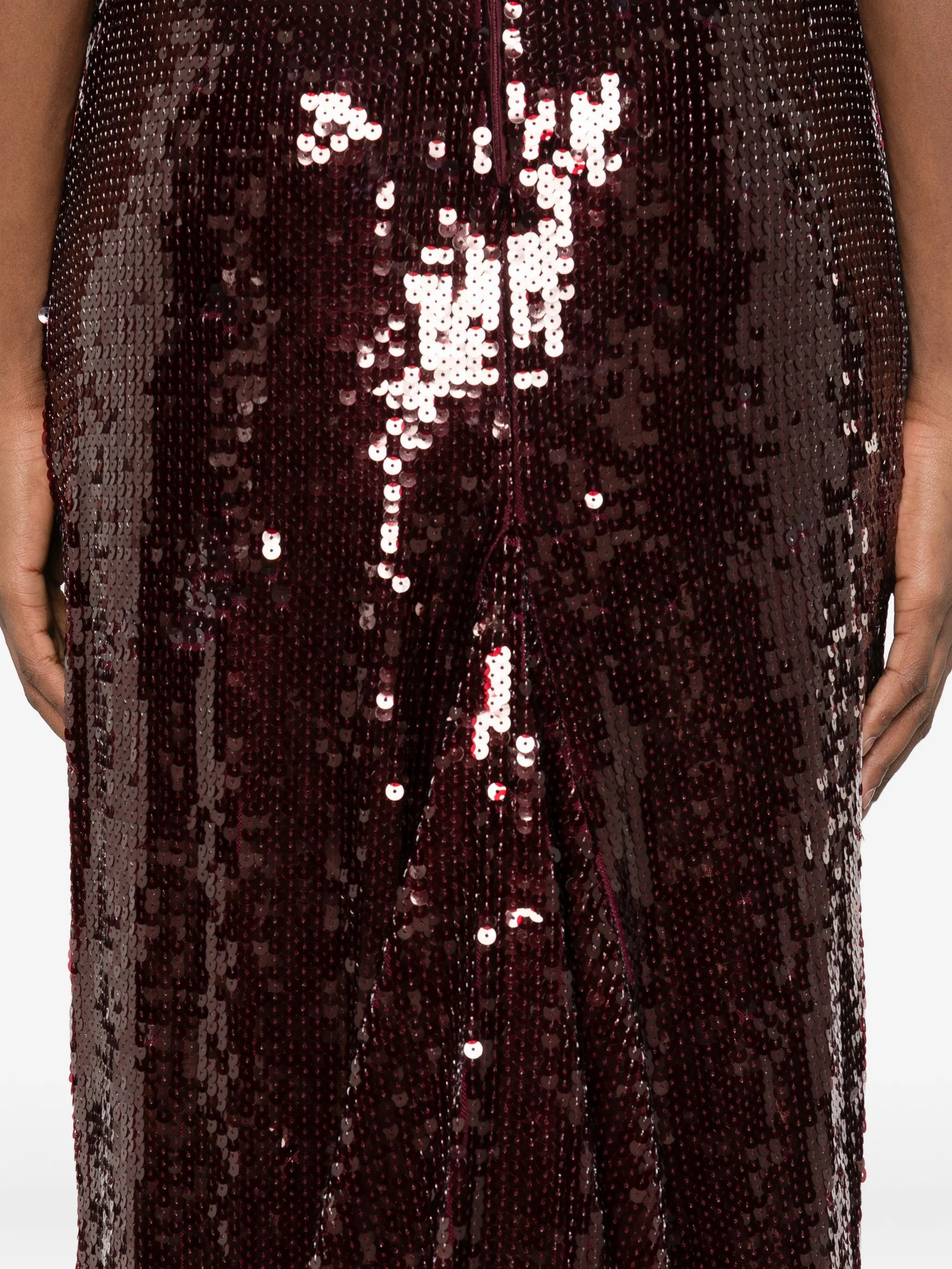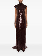 Make a stunning entrance in this show-stopping maxi dress from ROTATE BIRGERCHRISTENSEN. This floor-length gown features luxurious sequin embellishments that catch the light beautifully, creating an unforgettable sparkle with every movement. The elegant high neckline and cap sleeves offer sophisticated coverage while maintaining a glamorous silhouette.