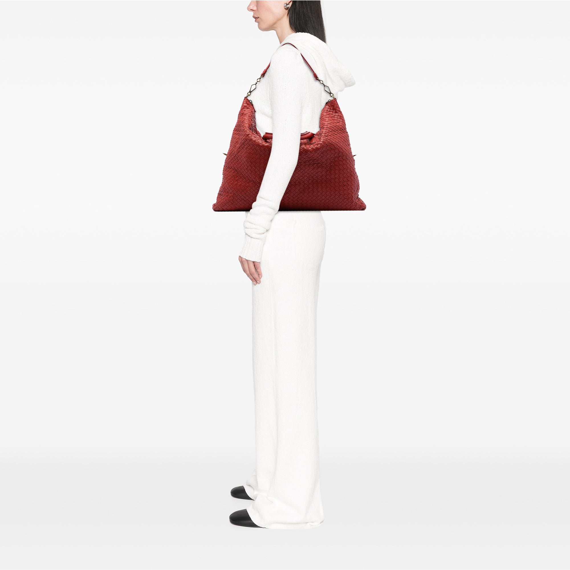 Elevate your everyday style with this stunning Bottega Veneta Maxi Intrecciato Nappa Convertible Satchel. Crafted from luxurious woven nappa leather in a rich burgundy hue, this iconic piece showcases the brand's signature Intrecciato weaving technique.
