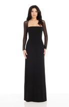 Elegance is easy with the Maxwell dress. This floor-length gown features sheer long sleeves and a chic square neckline, offering a blend of classic elegance and modern flair.
