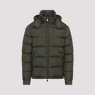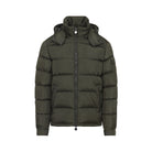 OLIVE GREEN NYLON DOWN JACKET. FEATURES A REMOVABLE AND ADJUSTABLE HOOD, ZIP AND SNAP BUTTON CLOSURE, ZIPPERED POCKETS, A PATCH POCKET WITH SNAP BUTTON ON THE LEFT SLEEVE, AND ADJUSTABLE HEM WITH DRAWSTRING. REGULAR FIT.