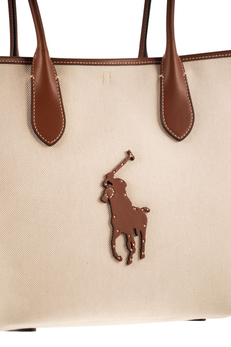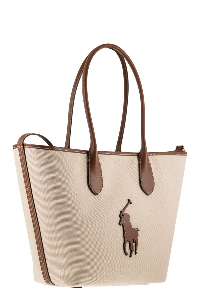 CRAFTED FROM COTTON CANVAS WITH LEATHER TRIM, THIS VERSION OF THE BELLPORT TOTE IS FINISHED WITH THE EXCLUSIVE BIG PONY LEATHER AND METAL HARDWARE THAT EVOKES POLO'S EQUESTRIAN HERITAGE. DESIGNED TO BE VERSATILE, THIS SPACIOUS BAG OFFERS TWO LOOKS IN ONE: A CLASSIC TOTE SILHOUETTE AND A TRAPEZOIDAL DESIGN, ACHIEVED BY CONNECTING THE LEATHER SHOULDER STRAP TO THE TOP RIGHT VIA THE D-RING ON THE TOP LEFT. THE BAG IS LINED ON THE INSIDE TO ENSURE FLEXIBILITY WITHOUT ALTERING ITS SHAPE. - TWO LEATHER HANDLES ON THE TOP, BOTH 16.5 CM - REMOVABLE AND ADJUSTABLE SHOULDER STRAP UP TO 53.5 CM - INTERNAL SNAP CLOSURE - LEATHER SHOULDER STRAP ON THE TOP RIGHT CONNECTS TO THE TOP LEFT VIA A D-RING TO CREATE A TRAPEZOIDAL SILHOUETTE - INTERNAL SLIP POCKET. FULLY LINED - EXCLUSIVE BIG PONY LEATHER APPLIQUé IN THE CENTRE ON THE FRONT DESIGNER ID: 428P05483 001 W 51 X H 28 X D 15 CM