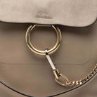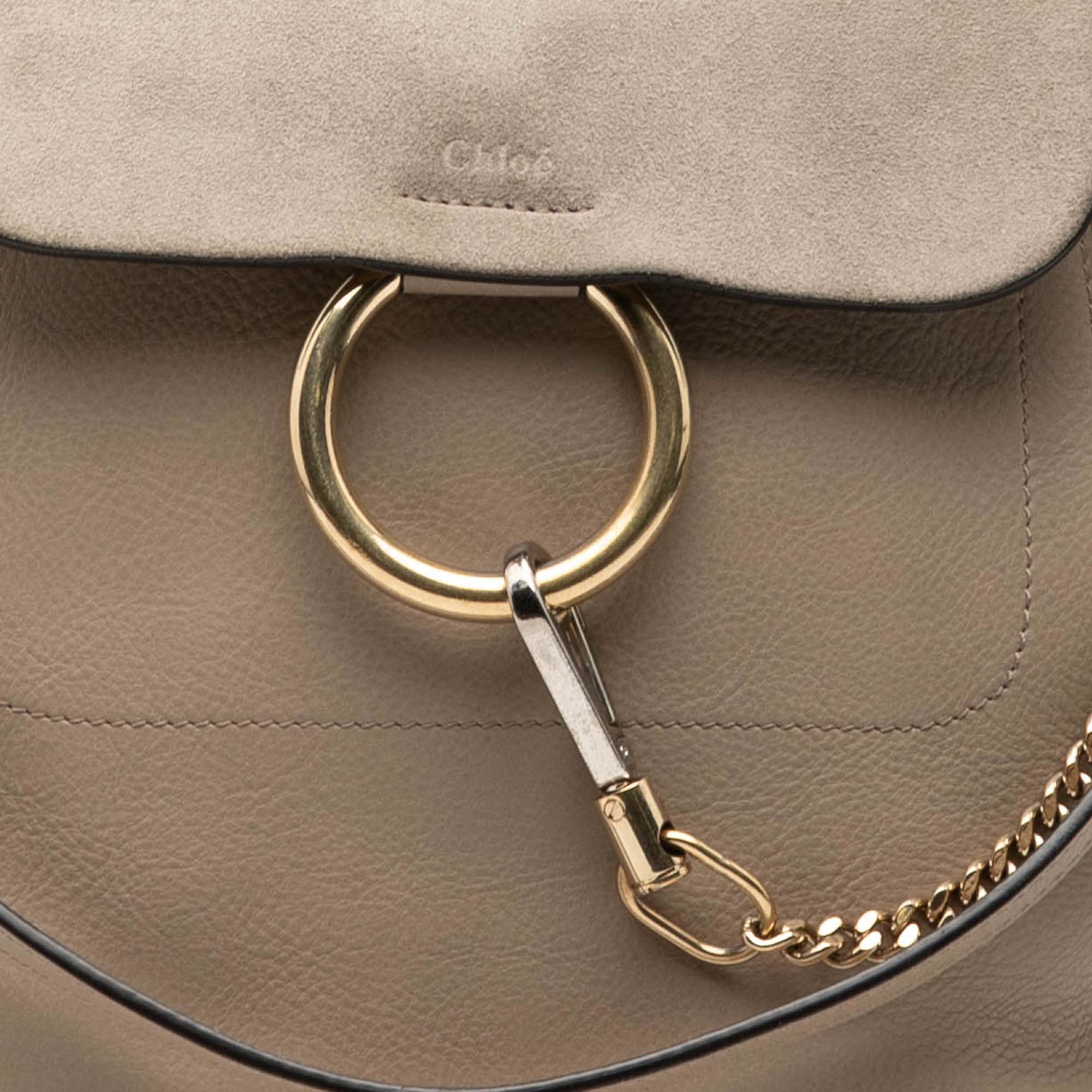 The Faye backpack features a leather body with zip details, adjustable flat back straps, a detachable shoulder strap, a suede front flap with a hook closure, and interior zip and slip pockets.