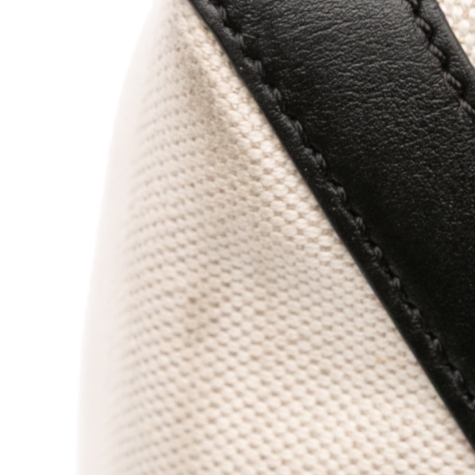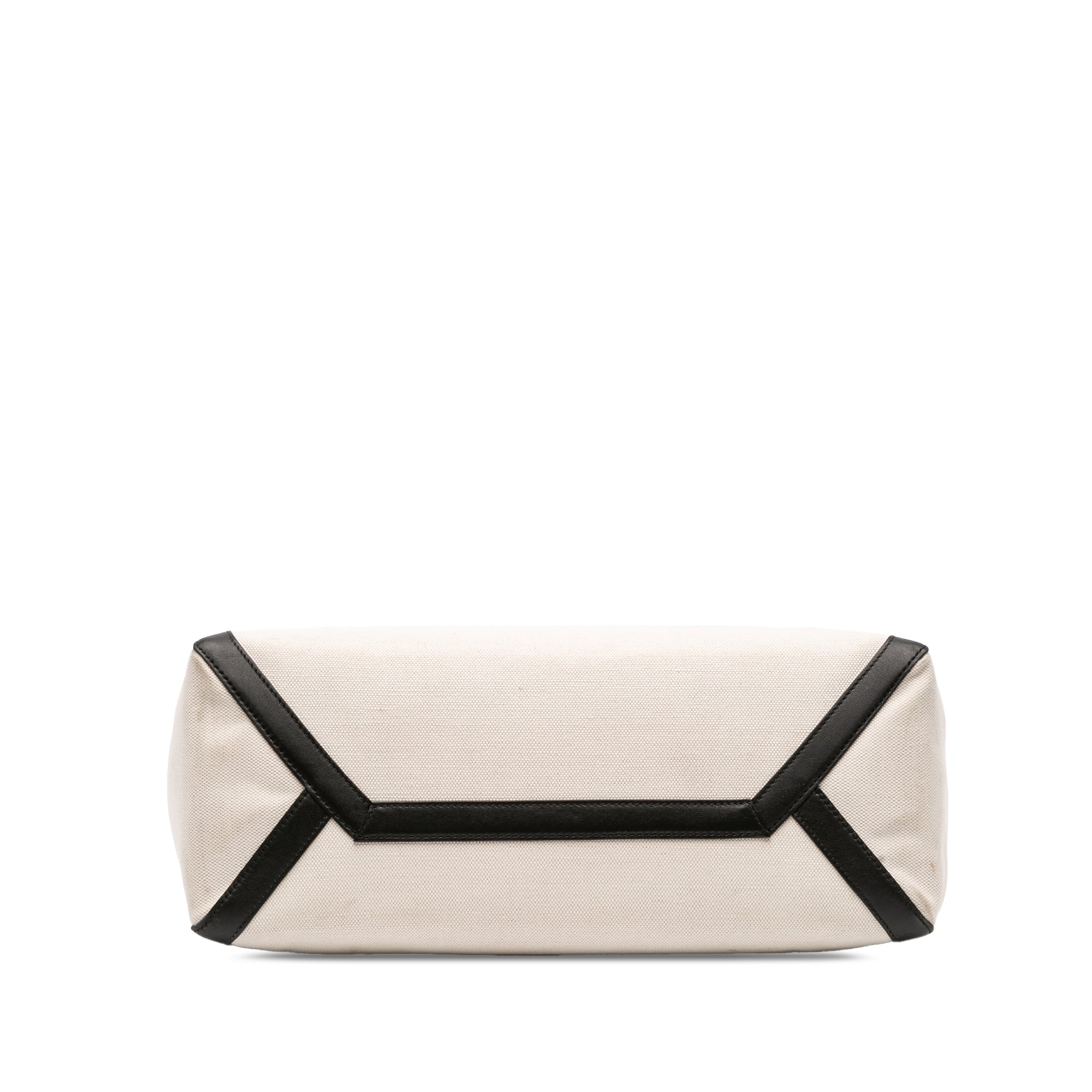 This satchel features a canvas body with leather trim and studs detail, flat leather handles, a top magnetic closure, and interior slip pockets.
