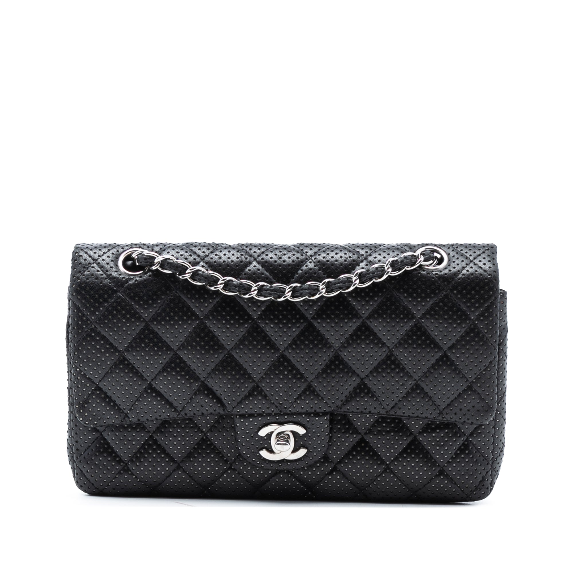 Elevate your style with this iconic Chanel Medium Classic Double Flap shoulder bag, a timeless investment piece that exudes sophistication and luxury. Crafted from exquisite perforated lambskin leather with the signature quilted pattern, this bag features the coveted CC turn-lock closure and elegant leather-woven chain link straps that can be worn on the shoulder or crossbody.
