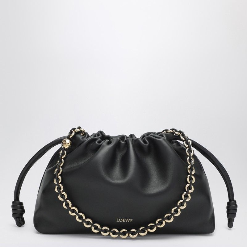 Introducing the Medium Flamenco Purse Bag by LOEWE, a stunning statement piece crafted from luxuriously soft black lambskin. This iconic design features a distinctive ruched silhouette with elegant side knots that create a beautifully gathered effect.