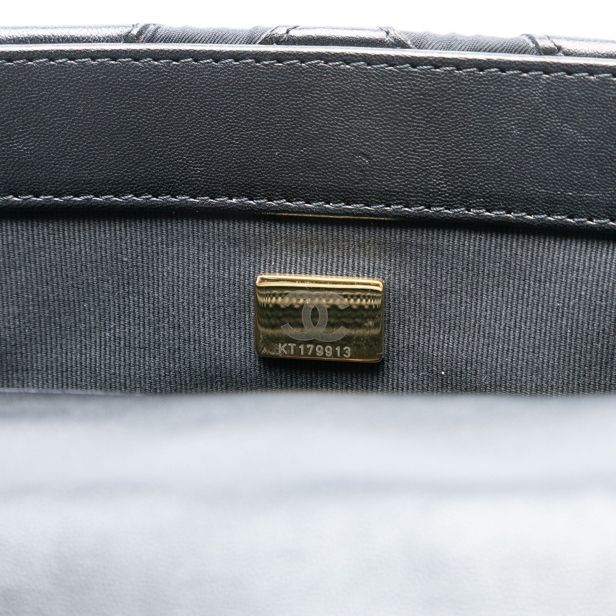 The Medium 19 Flap bag features a quilted lambskin leather and printed silk body, a chain handle, a leather-woven chain shoulder strap with leather guard, a flap with a CC twist lock closure, an exterior slip pocket, and an interior zip pocket.