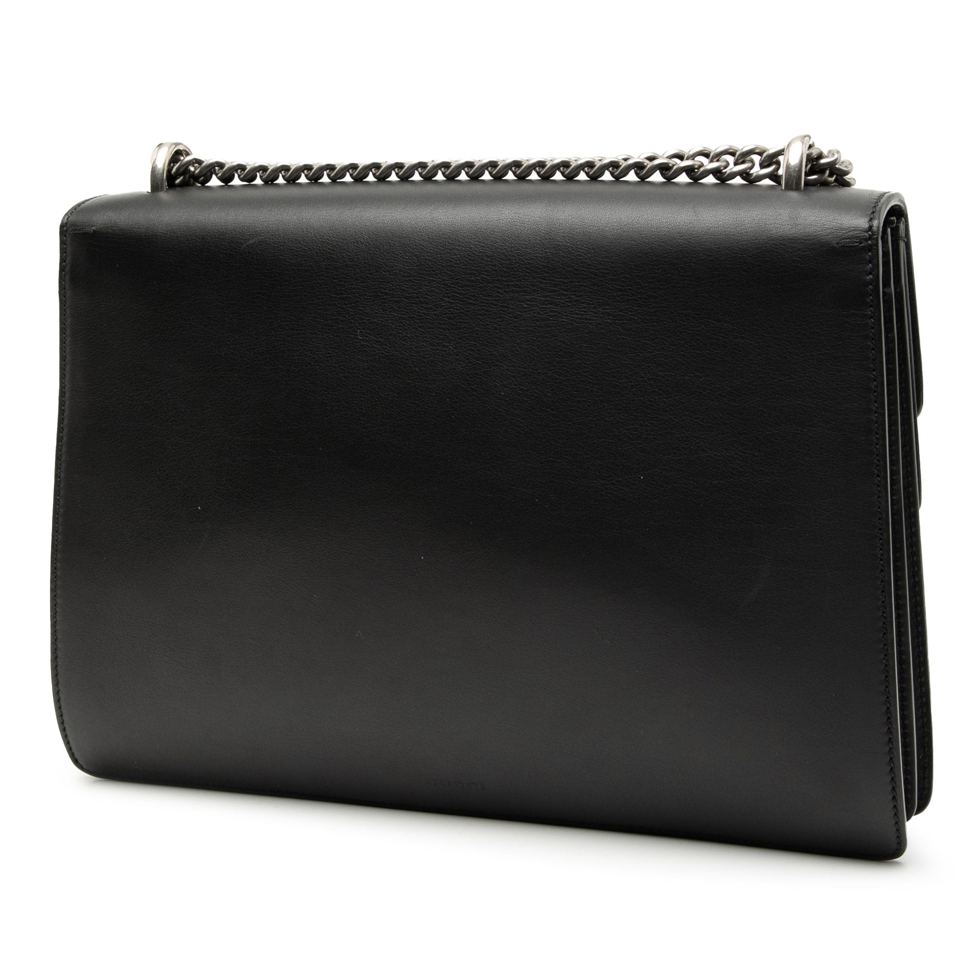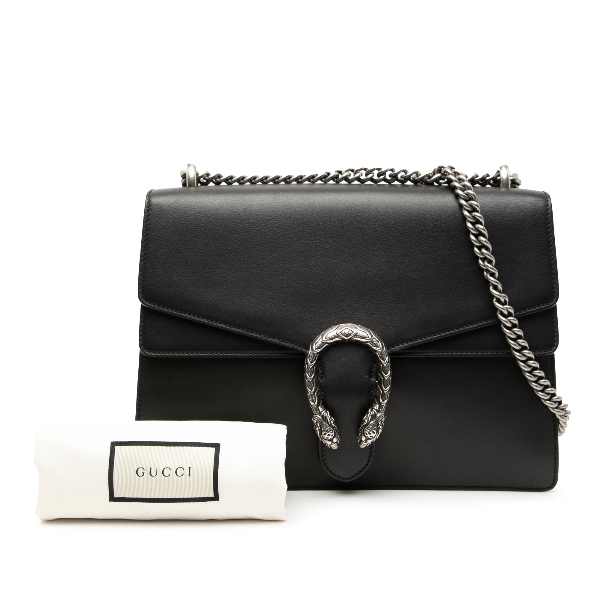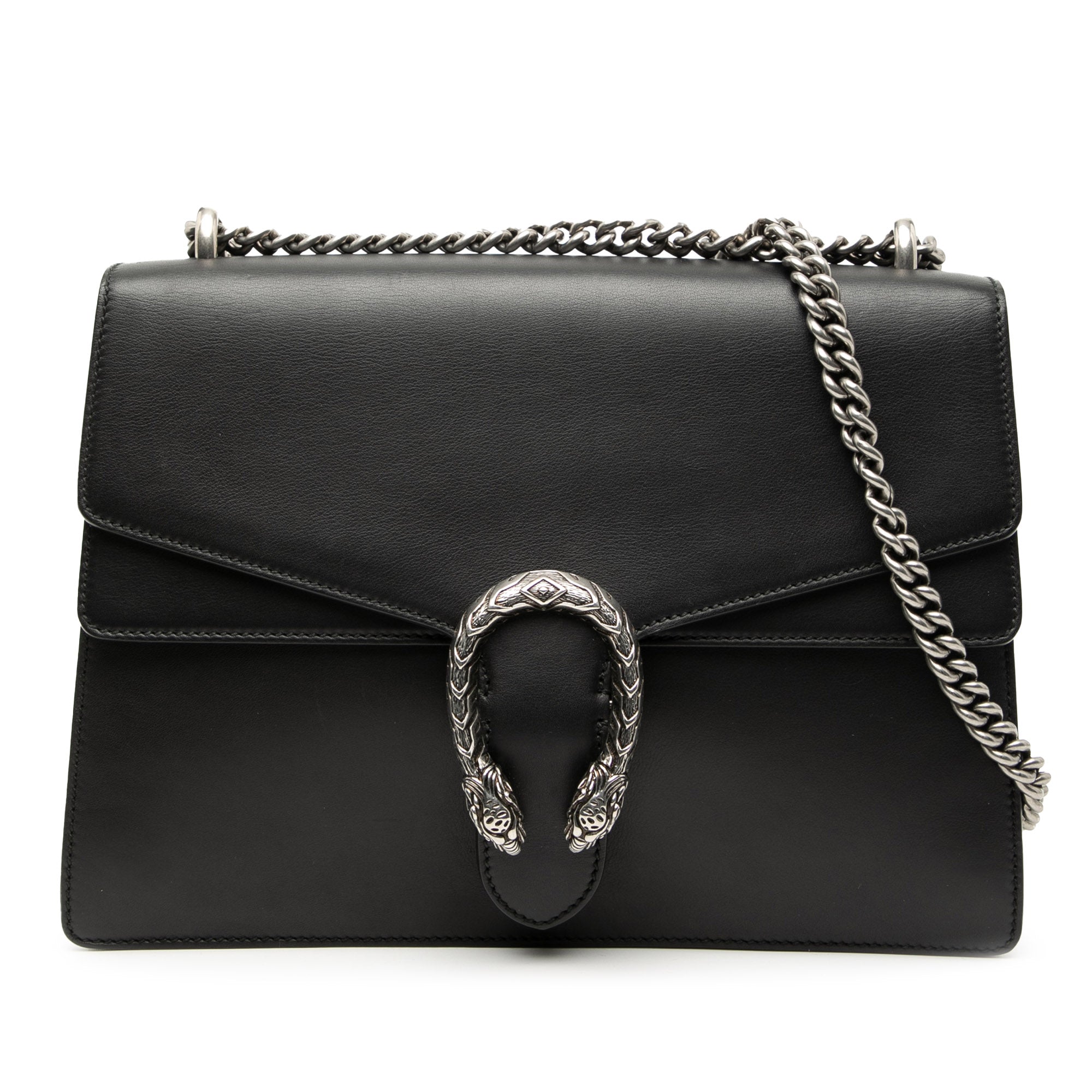 The Dionysus features a leather body, a chain link strap, a top flap with a push lock closure, and an interior zip pocket.