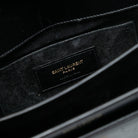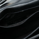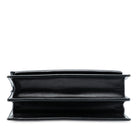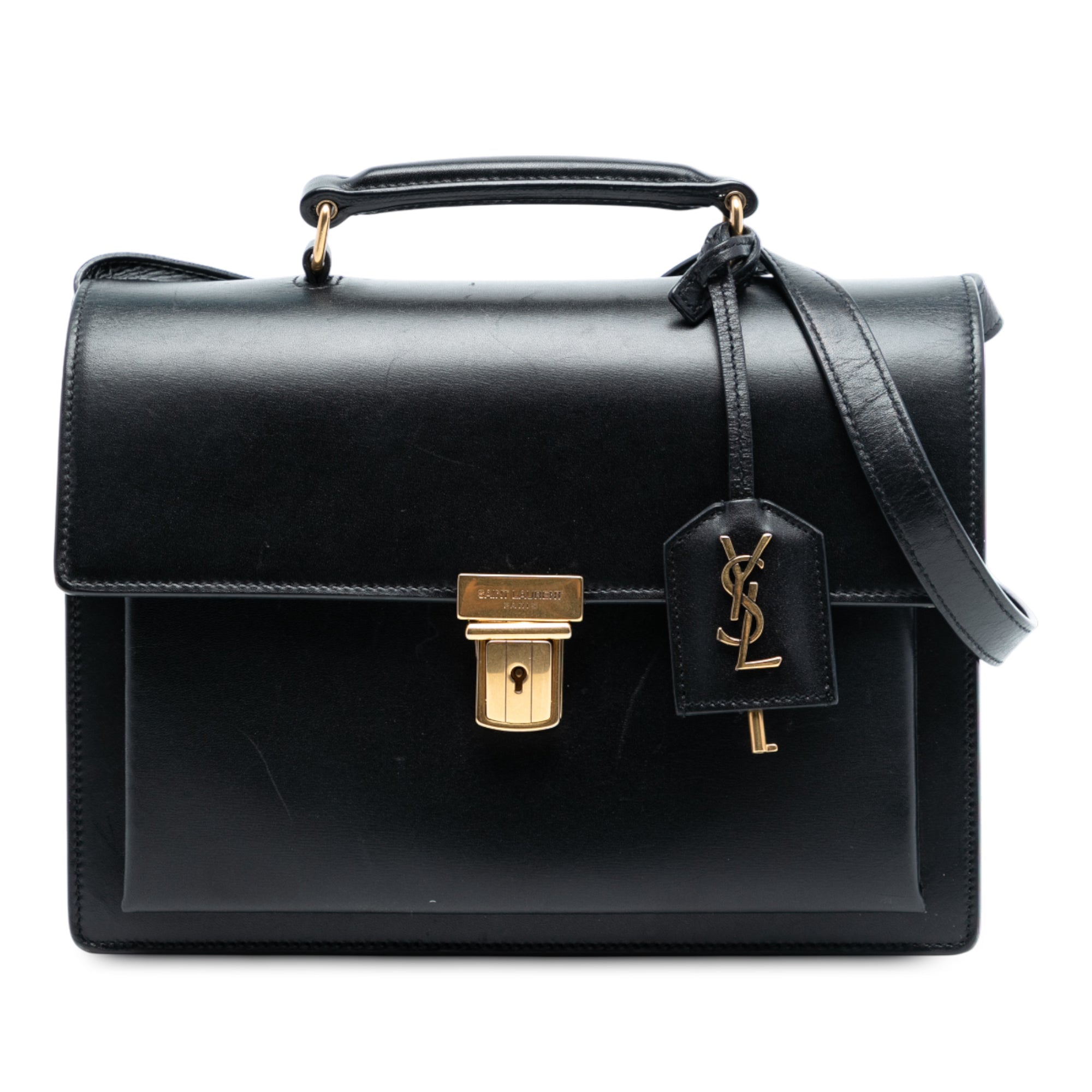 The High School features a leather body, a rolled top handle, a detachable flat strap, a front flap with slide lock closure, and interior slip pockets.