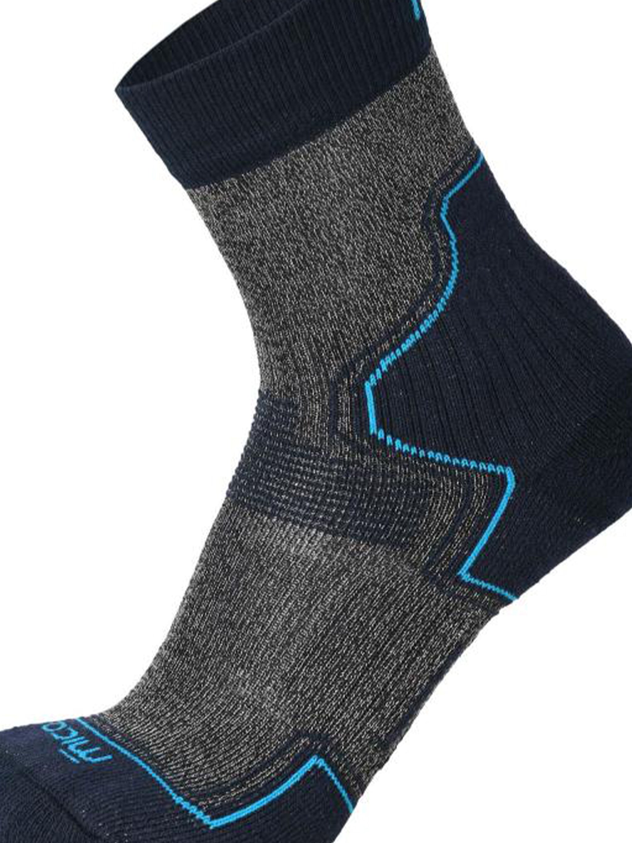 The sleek gray and navy design with blue accent details adds a modern touch to your outdoor gear. Whether you're hitting the trails or exploring new destinations, these premium socks from MICO deliver the reliability and comfort you need for any adventure.