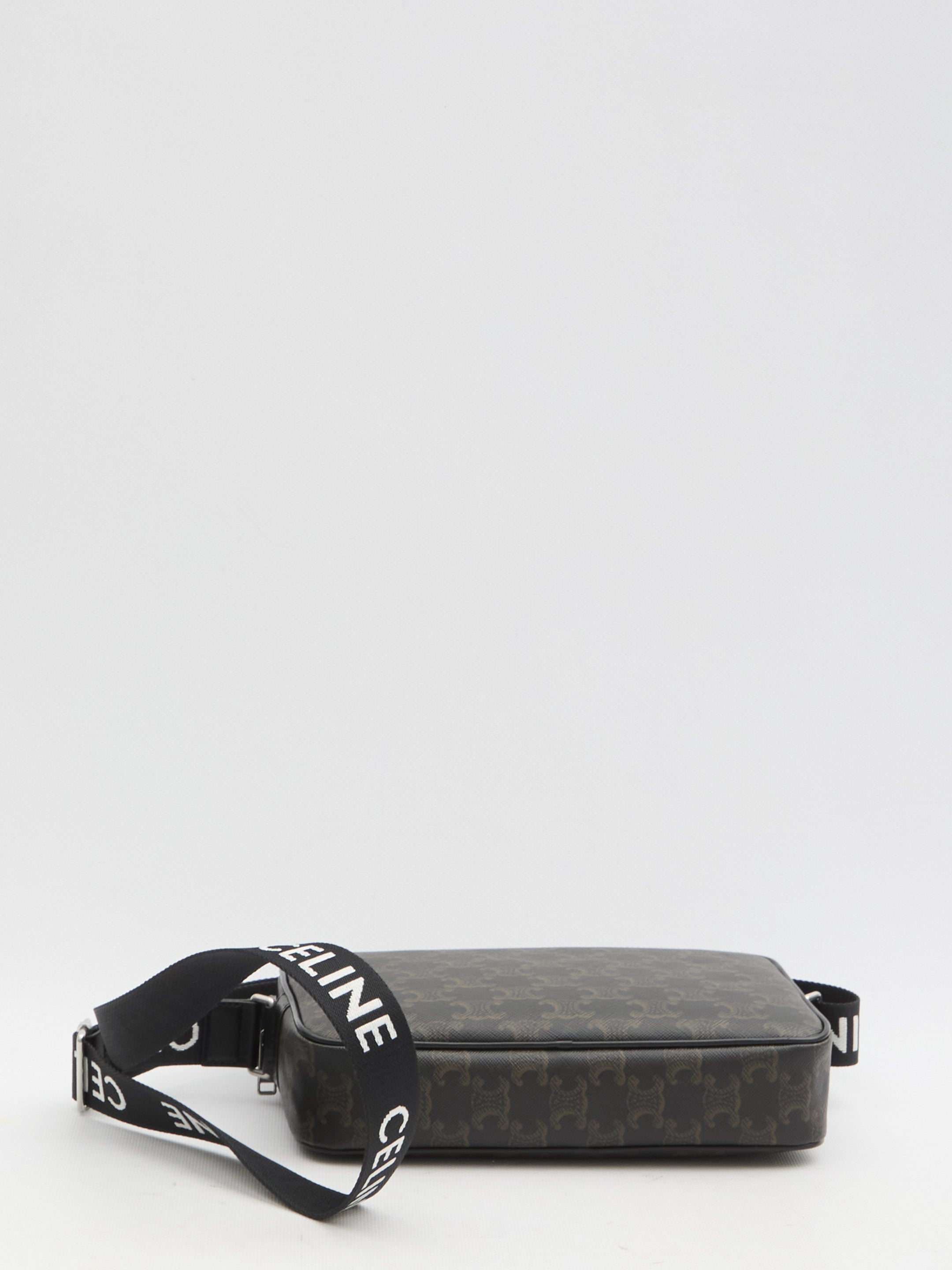 MEDIUM MESSENGER BAG IN TRIOMPHE CANVAS WITH CALFSKIN TRIMS. IT FEATURES ADJUSTABLE RIBBON SHOULDER WITH CELINE LOGO, ZIP CLOSURE, ONE MAIN INTERIOR COMPARTMENT AND ONE INTERIOR FLAT POCKET. FABRIC LINING.