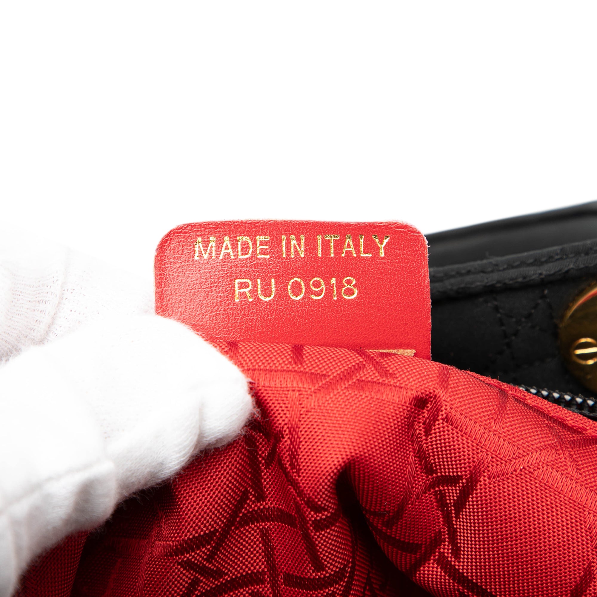 The Lady Dior features a nylon body, rolled handles, a top zip closure, and interior zip and open pockets.