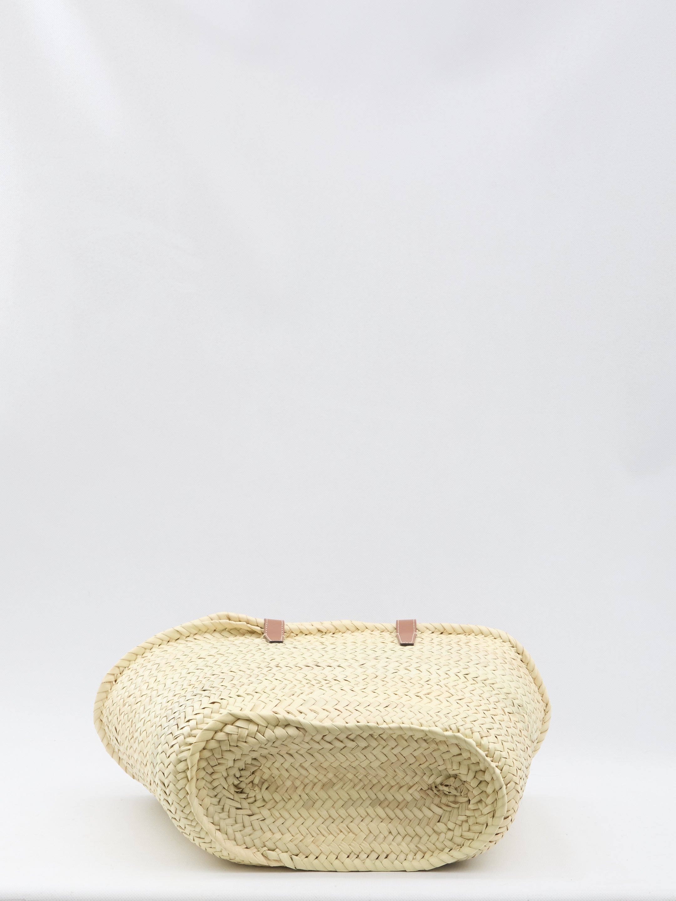 HAND-WOVEN BASKET BAG WITH PALM LEAVES AND CALFSKIN TRIM. FEATURES LEATHER HANDLES AND A LEATHER TRIOMPHE DETAIL. COMES WITH A DUST BAG.
