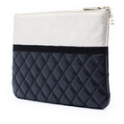 This stunning Chanel Medium O-Case Clutch features luxurious quilted lambskin and metallic calfskin leather with the iconic diamond-quilted pattern. The sleek design includes a top zip closure for secure storage, making it perfect for evening events and special occasions.