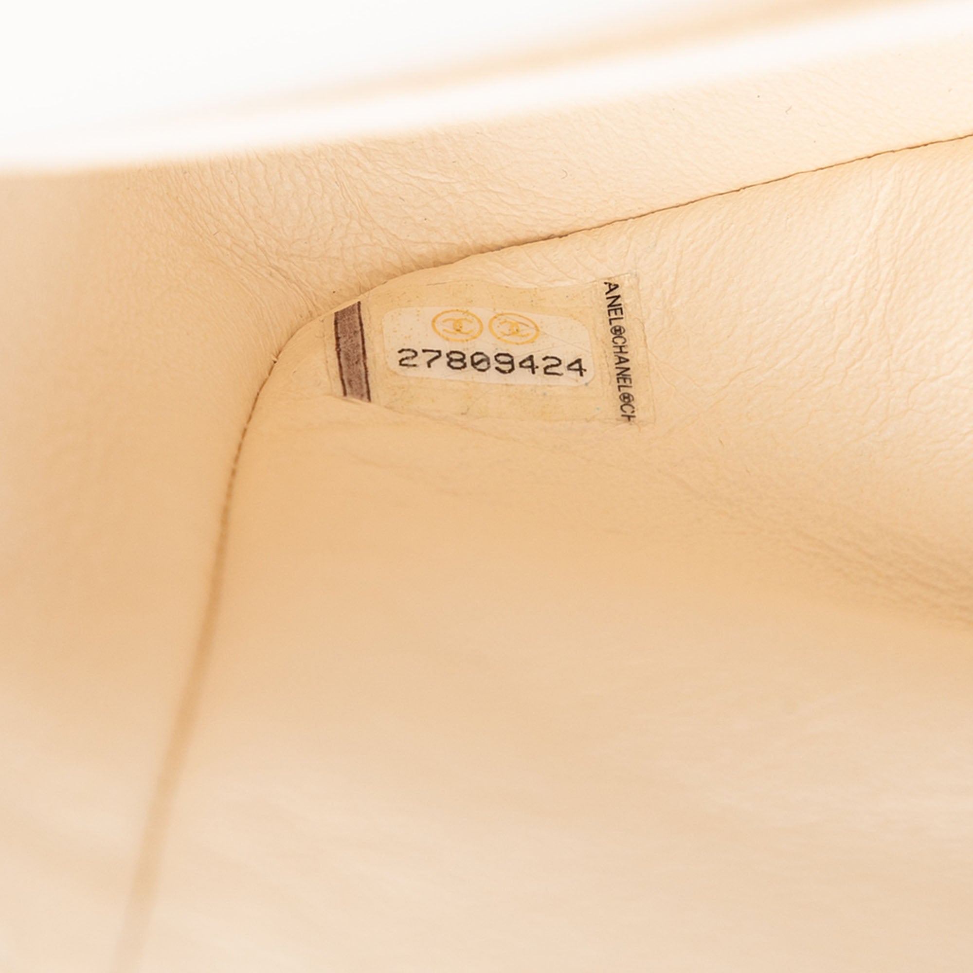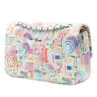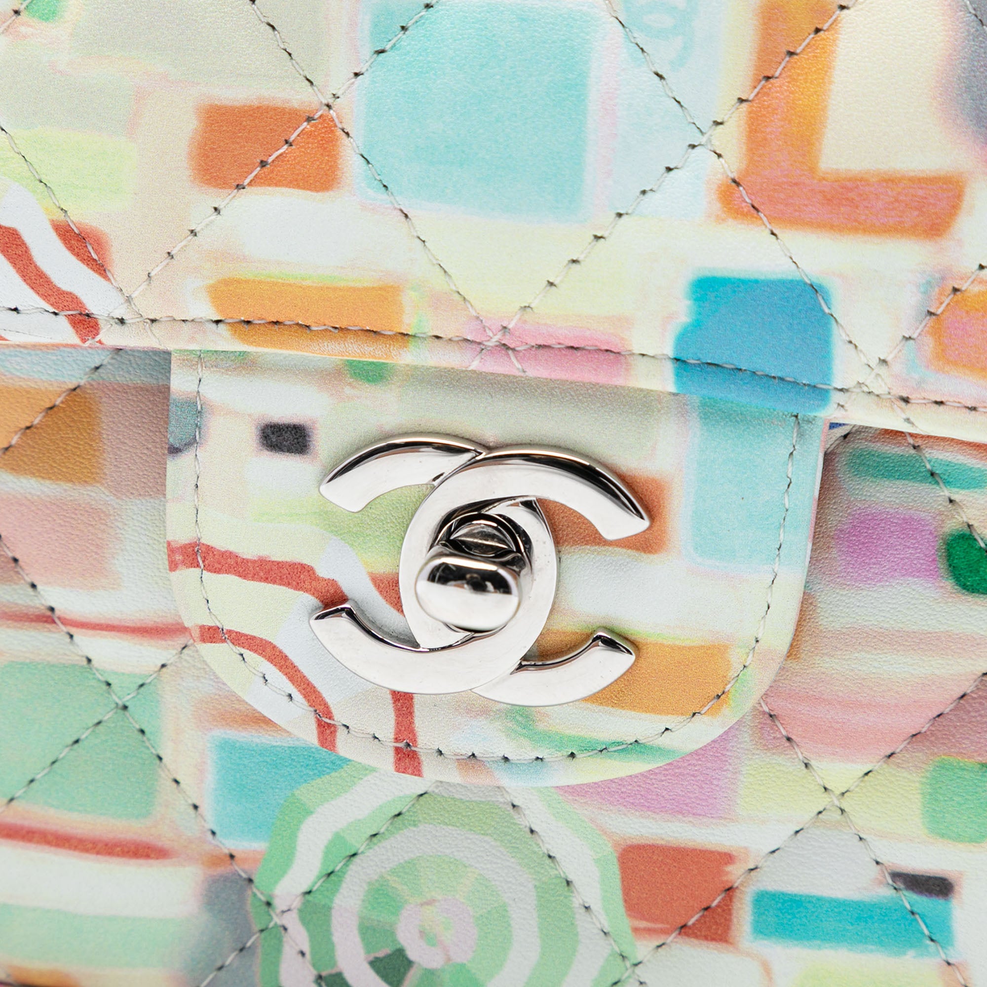 This shoulder bag features a quilted printed leather body, leather woven chain shoulder straps, double front flaps with CC turn-lock closure, an exterior back slip pocket, and interior slip pockets.