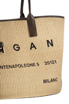 Elevate your warm-weather wardrobe with this stunning medium raffia tote from Hogan. Crafted from natural woven raffia with luxurious brown leather trim and top handles, this designer tote effortlessly combines casual elegance with Italian sophistication.