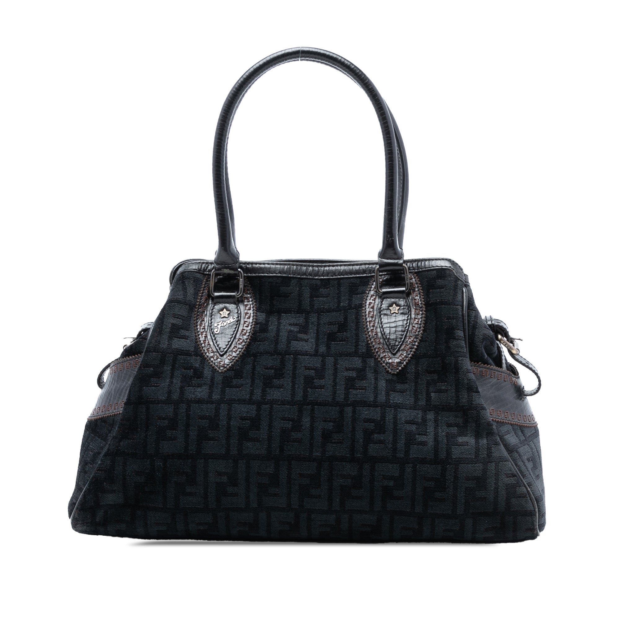 This handbag features a velvet body with leather trim, rolled leather handles, an open top with snap button closures, and an interior zip pocket.
