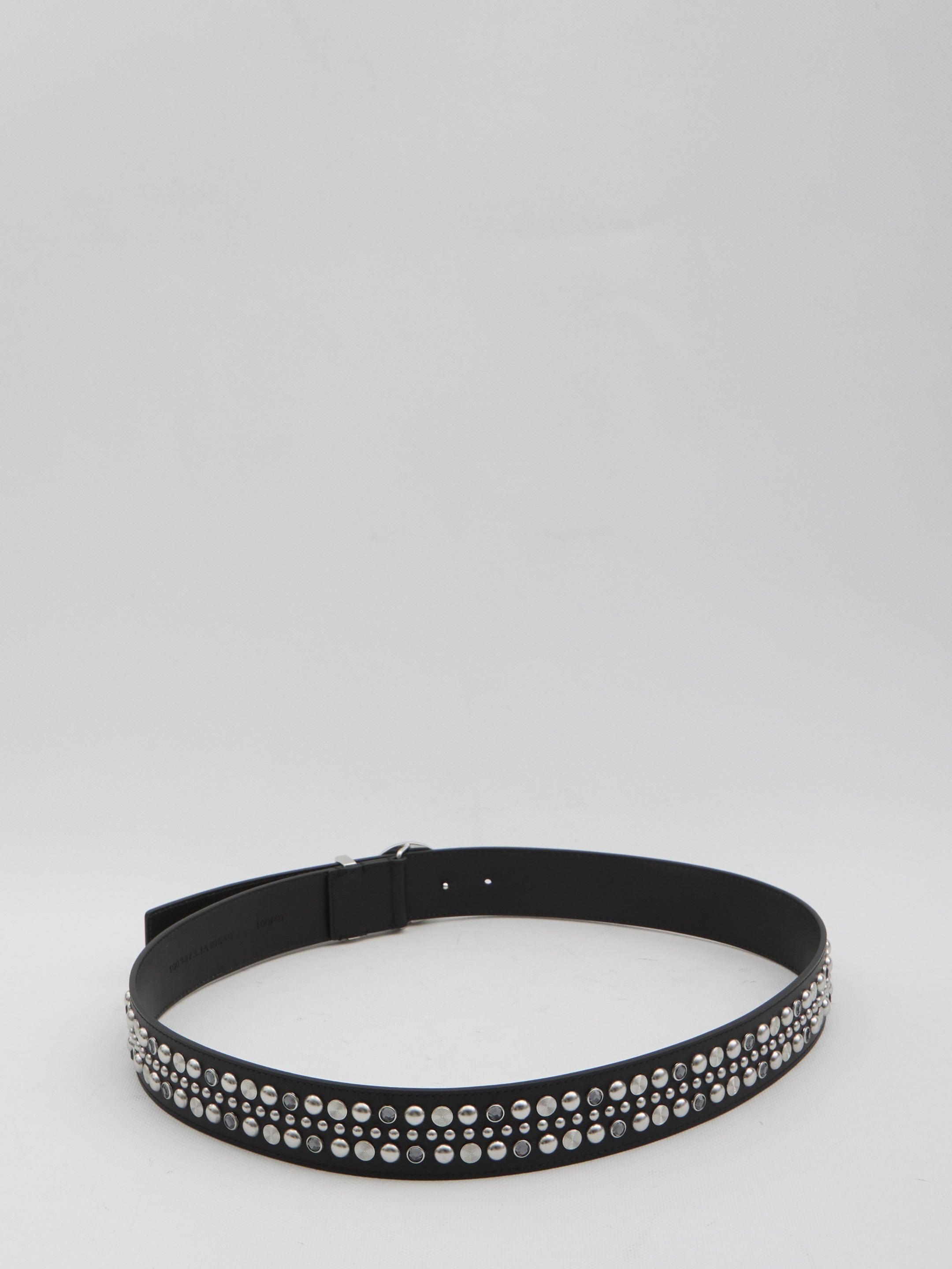 Black lamb leather belt with applied studs and palladium Medusa buckle. Any imperfections in the leather should not be considered manufacturing defects, but rather a characteristic of the material.