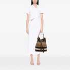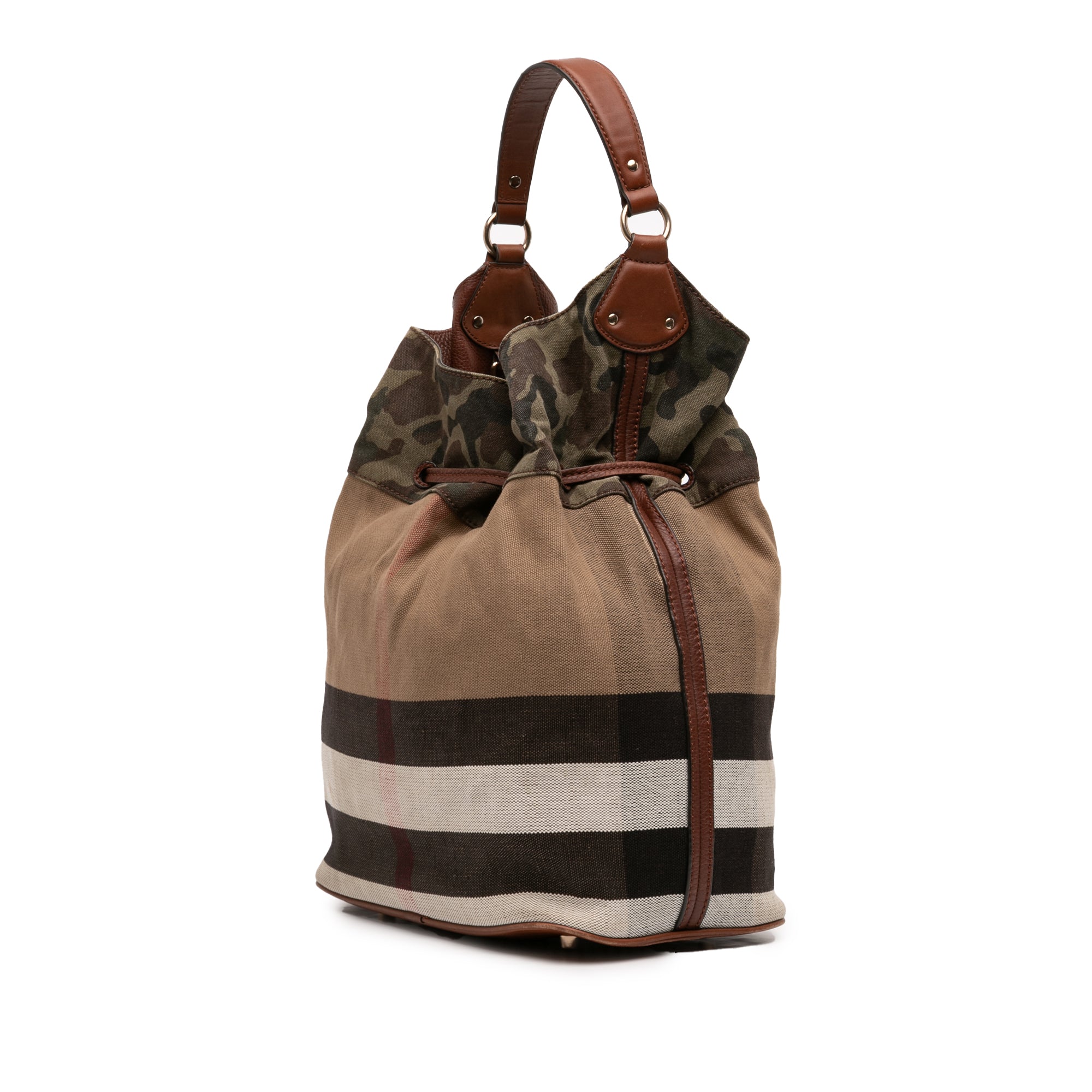 The Burberry Susanna Bucket Bag is a stunning blend of heritage and contemporary style. Featuring the iconic Burberry Mega Check canvas in warm tan tones paired with a distinctive camouflage print top, this bag makes a bold fashion statement.