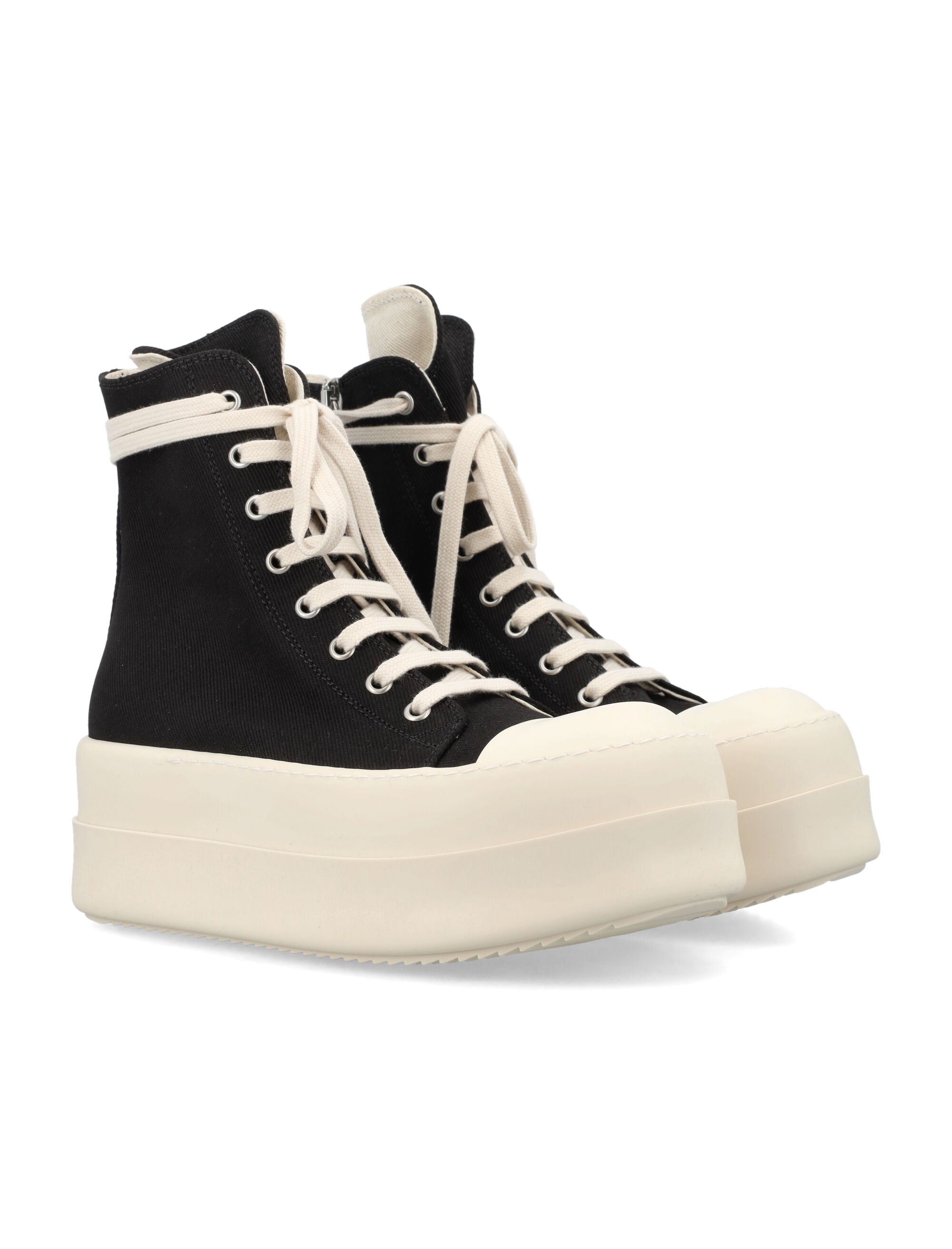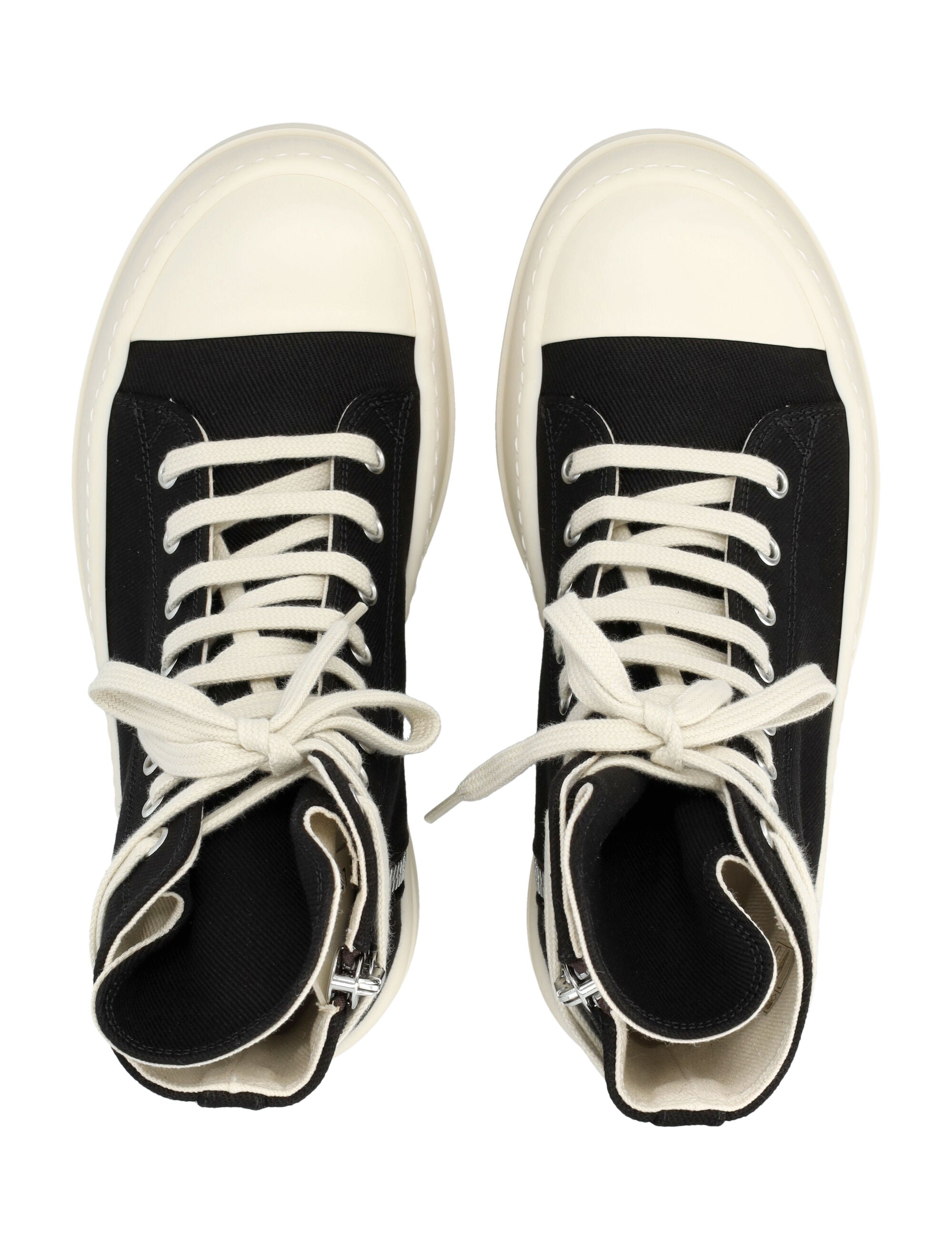 These striking high-top sneakers feature a classic black canvas upper with contrast cream laces, all set atop Rick Owens' signature exaggerated platform sole that adds dramatic height and unmistakable presence.
